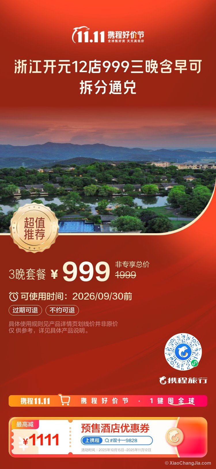 浙江开元12店999三晚含早可拆分通兑