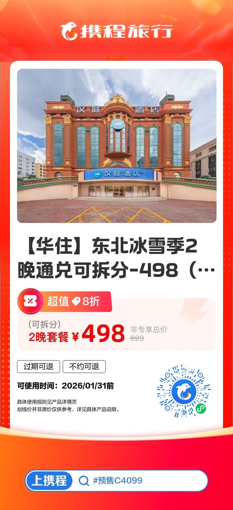 【华住】东北冰雪季2晚通兑可拆分只需498(全季/桔子/汉庭等)