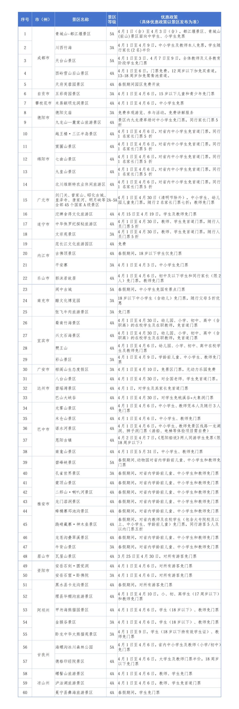 四川春假、清明免票景区汇总表