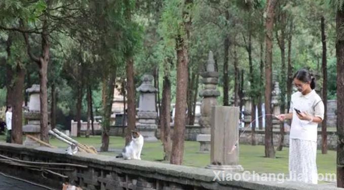 游客在《黑神话:悟空》取景地四门塔风景区逗猫,该景区也被称为“猫猫寺”。中新社记者 王采怡 摄