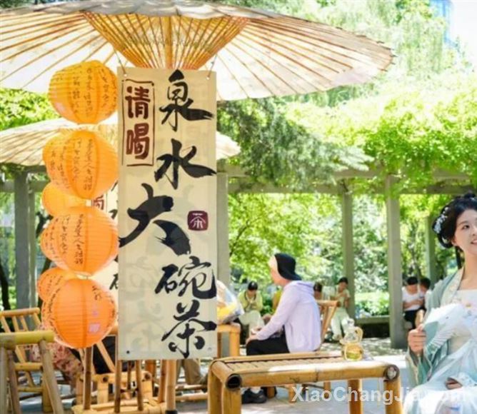 游客穿古装在泉水市集旁拍照打卡、品尝泉水大碗茶。天下第一泉风景区供图