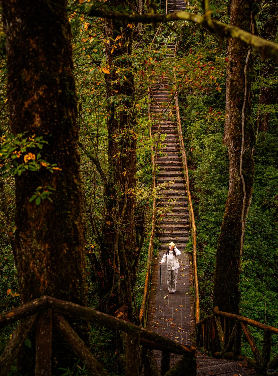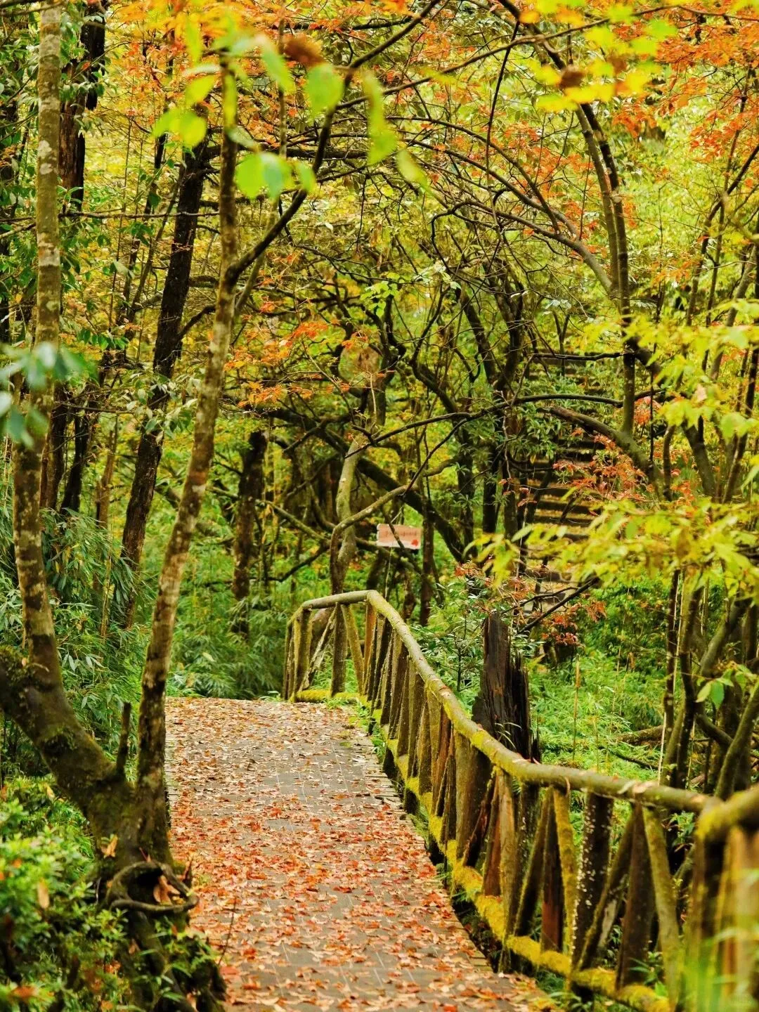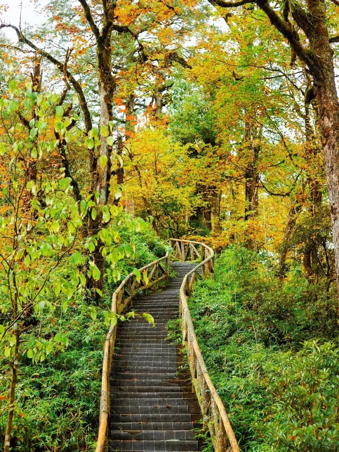 而走到瀑布旁,红透的树干自成绝佳相框;踏上长梯,红黄橙绿的彩叶就是你的天然打卡墙。