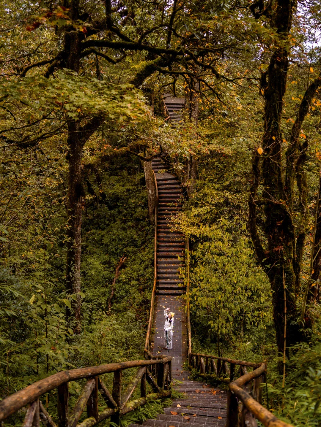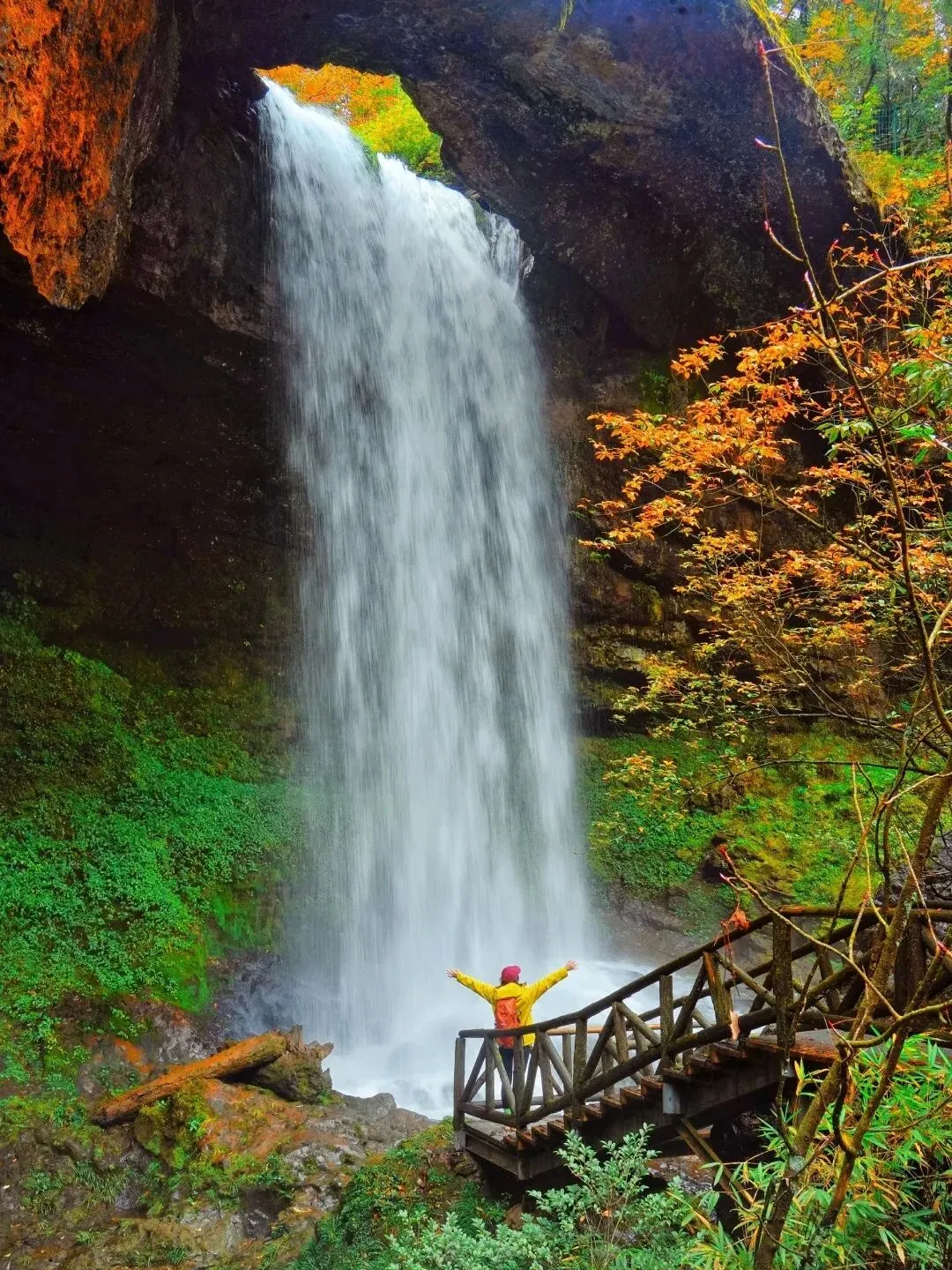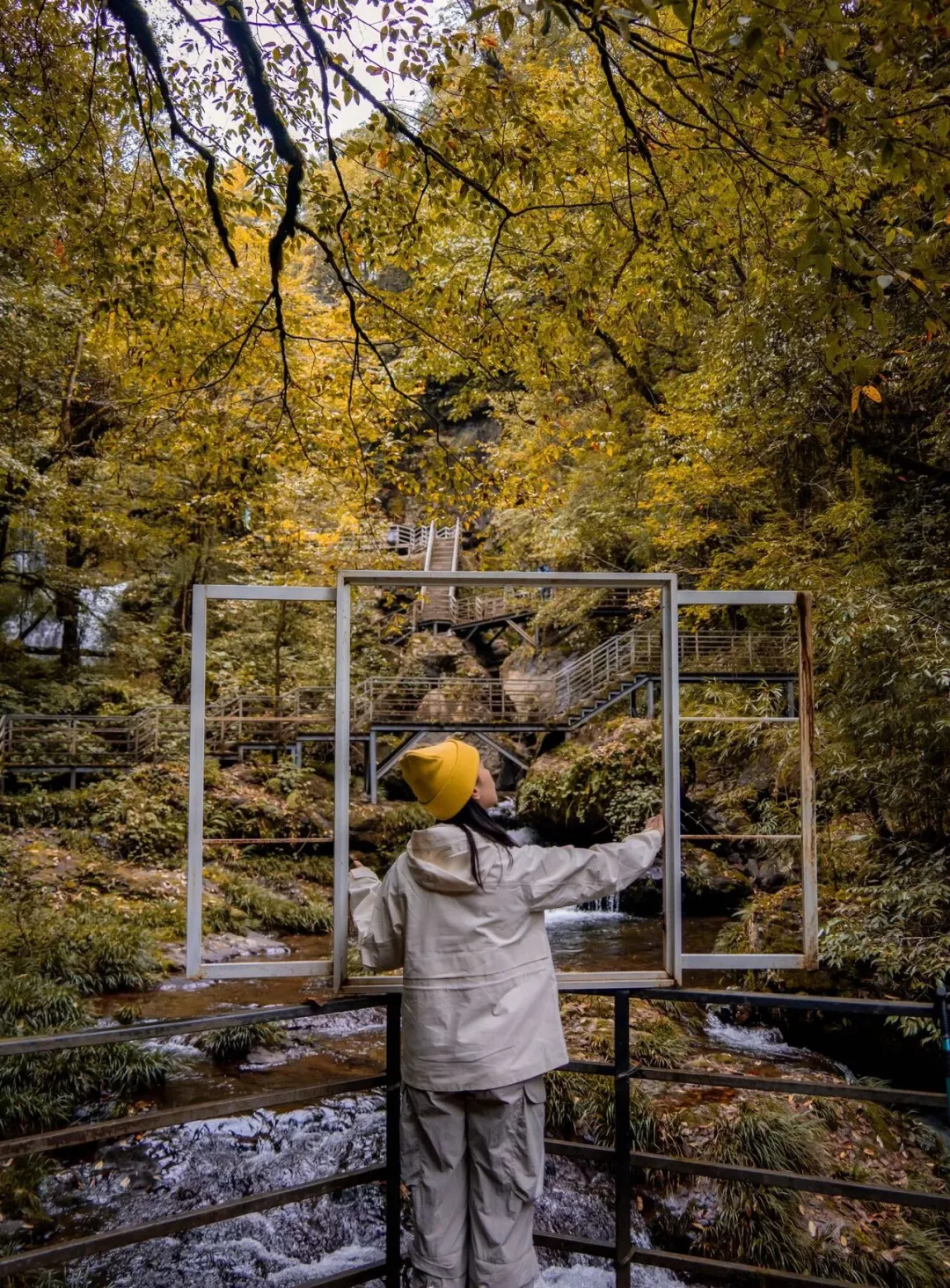 而走到瀑布旁,红透的树干自成绝佳相框;踏上长梯,红黄橙绿的彩叶就是你的天然打卡墙。