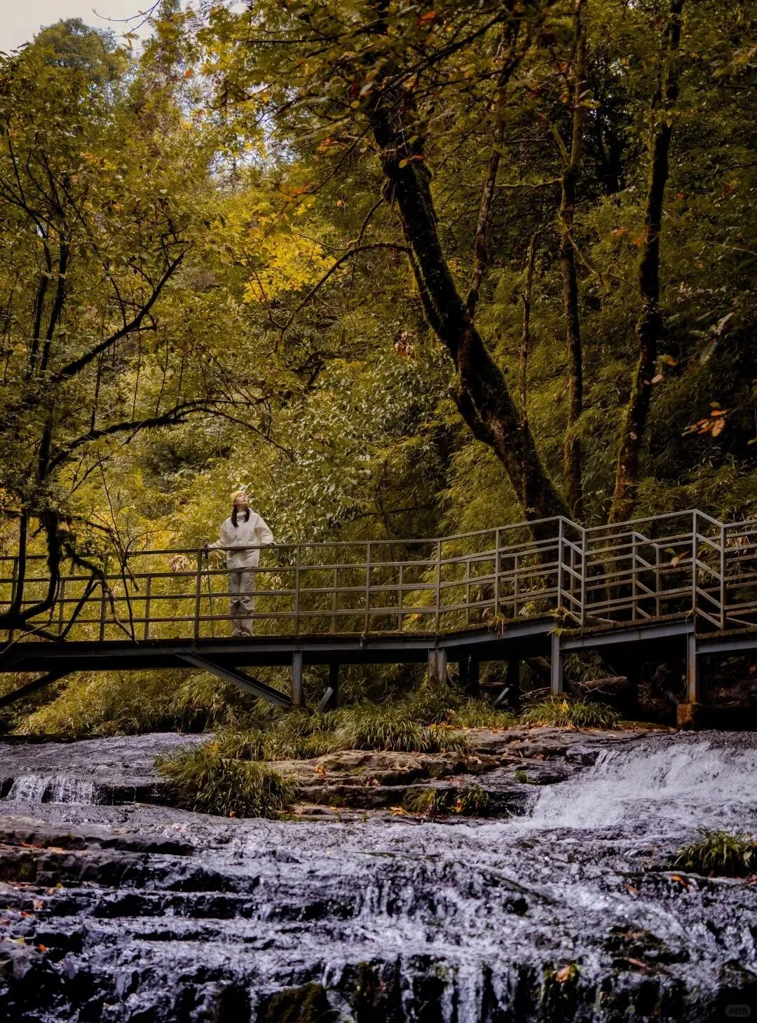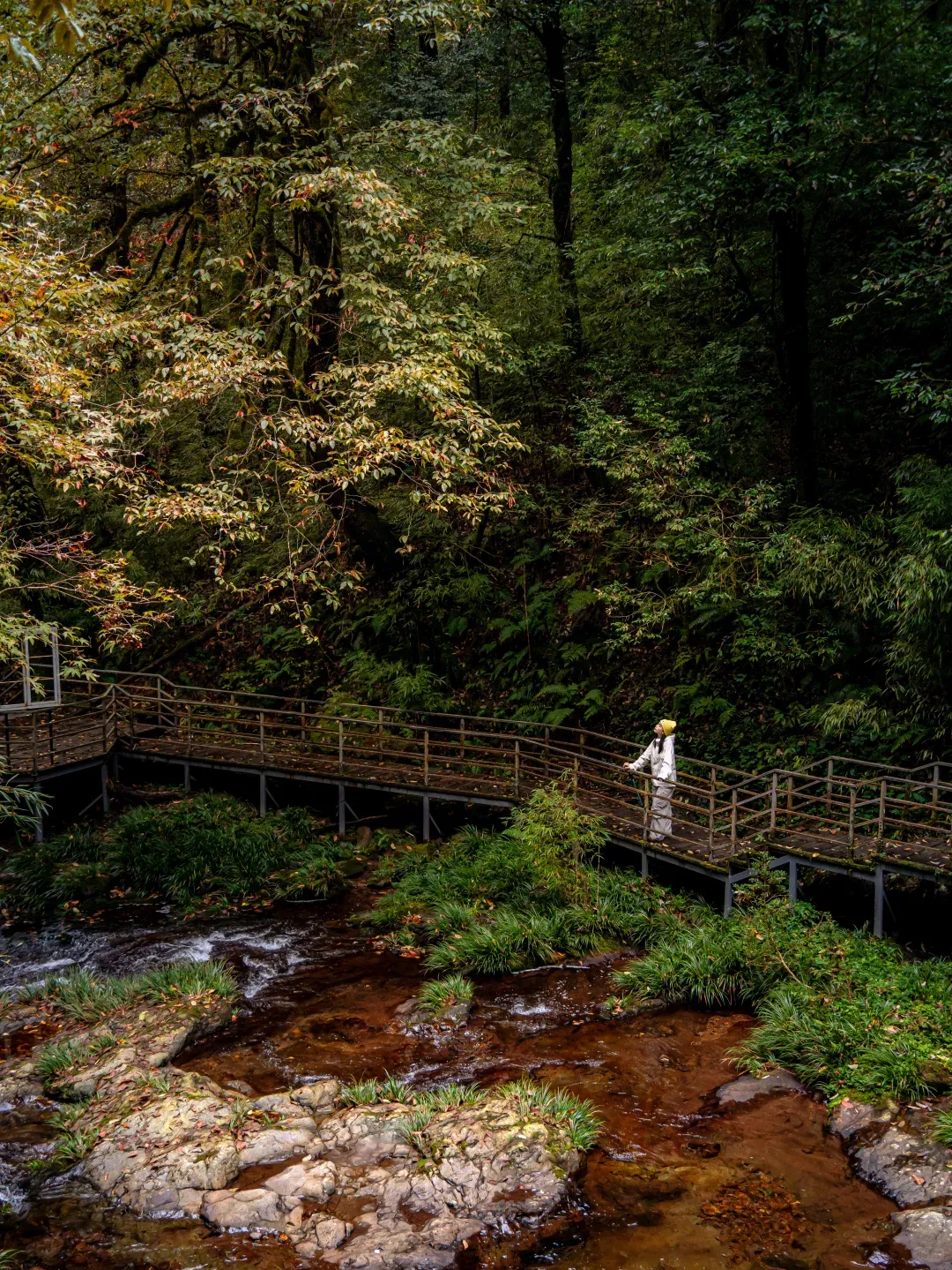 栈道顺着溪流弯弯曲曲,耳边是哗啦啦的流水声,像自带白噪音BGM。