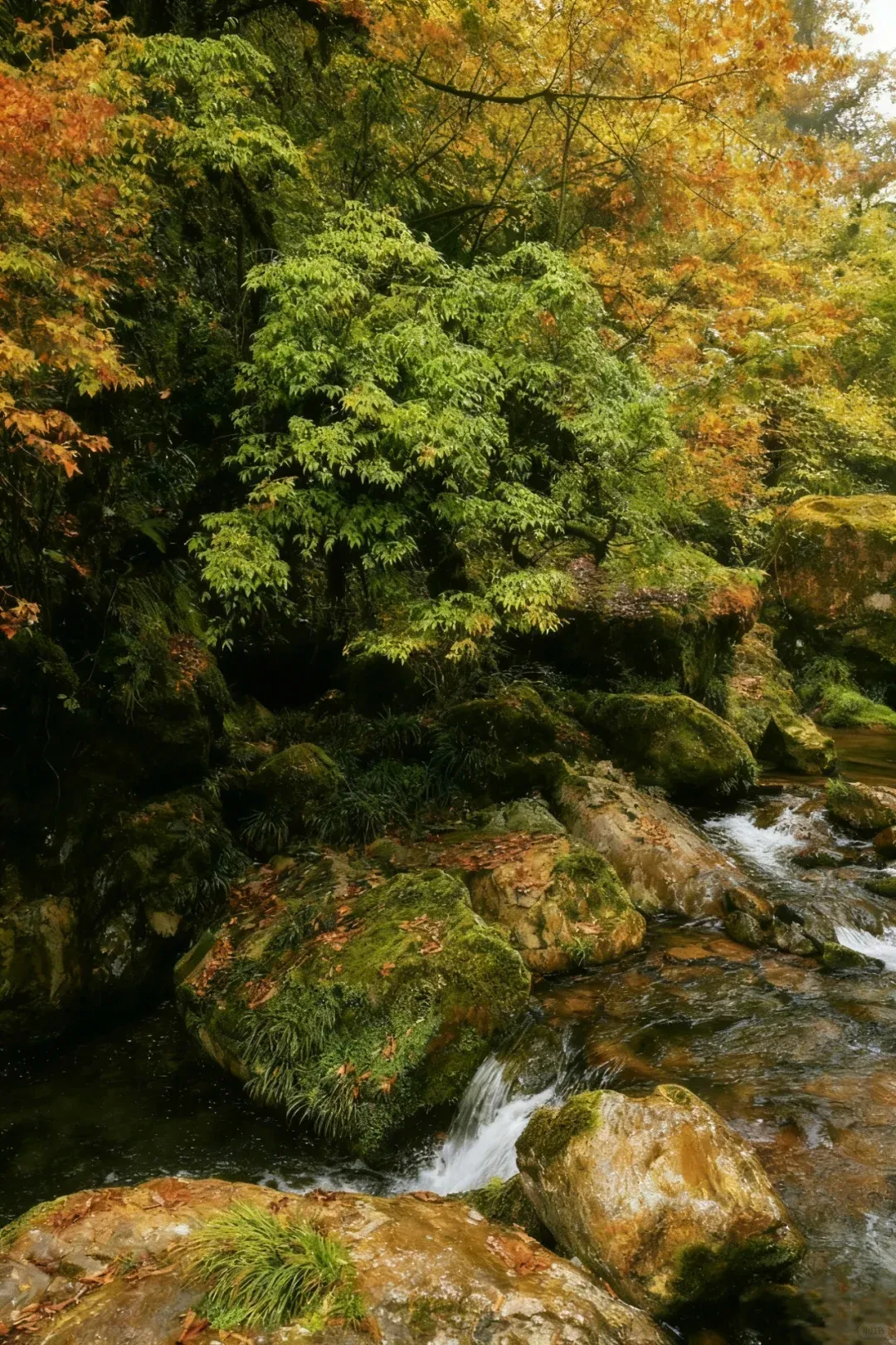 山间多处瀑布溪流构成浓墨重彩的山水画,各色树木浓缩了不同秋色,每走一段就有新的惊喜。