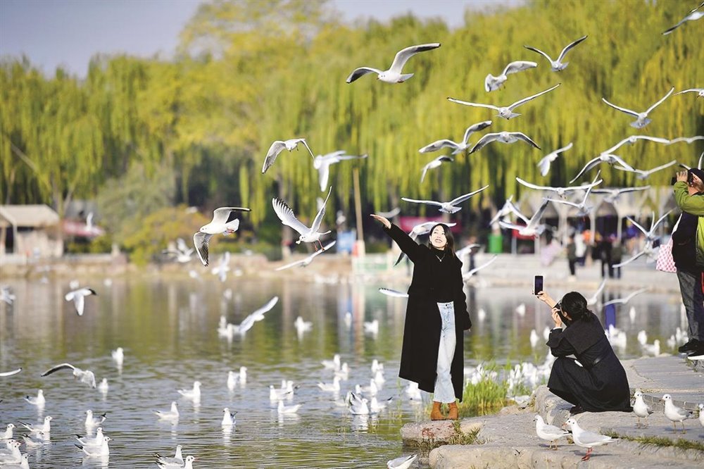 海宝公园则更添几分灵动。繁茂的树木间、如镜的湖面上,红嘴鸥翩跹起舞,时而掠过水面,时而与游人嬉戏互动,秋日的暖阳为这一幕幕温馨画面镀上金边。