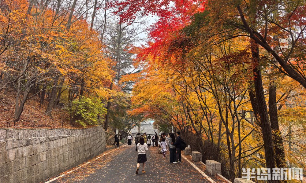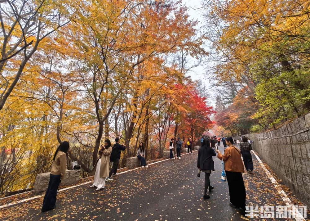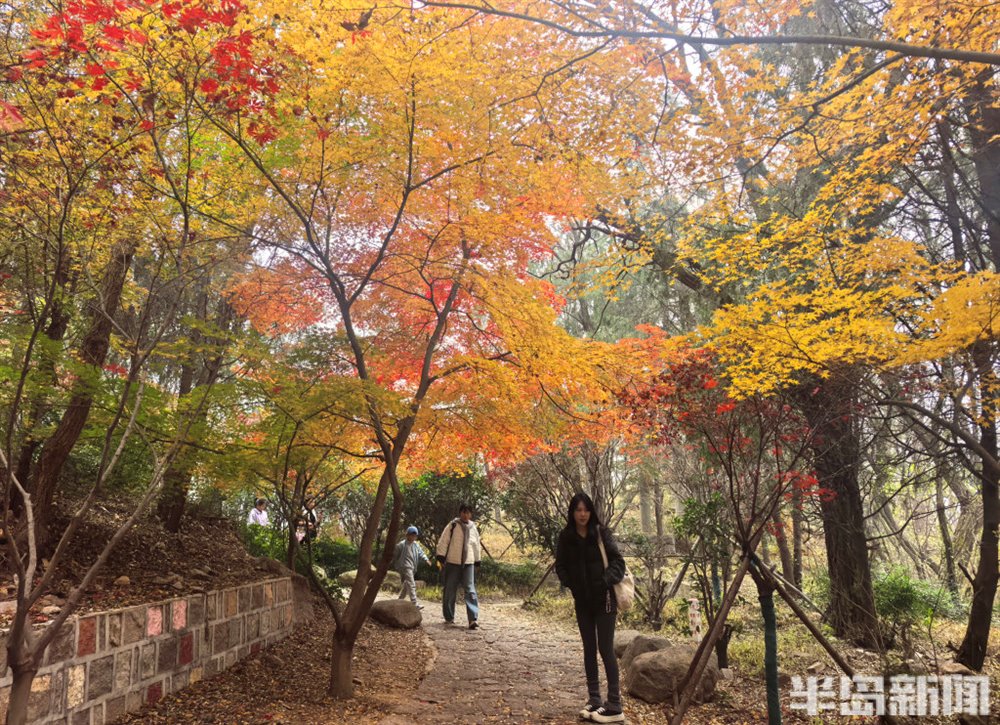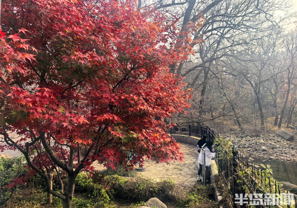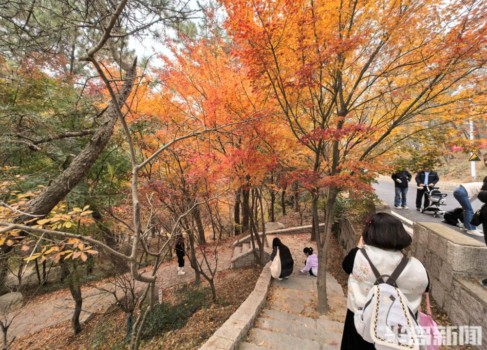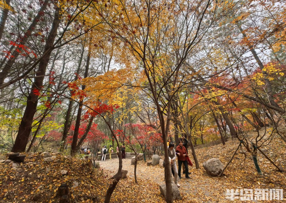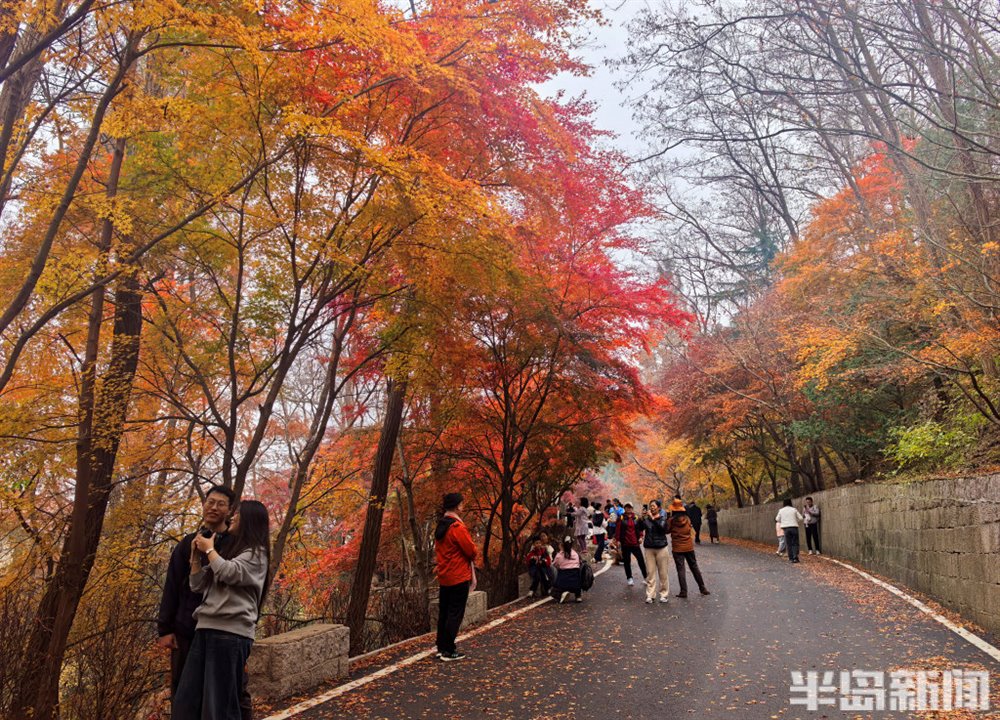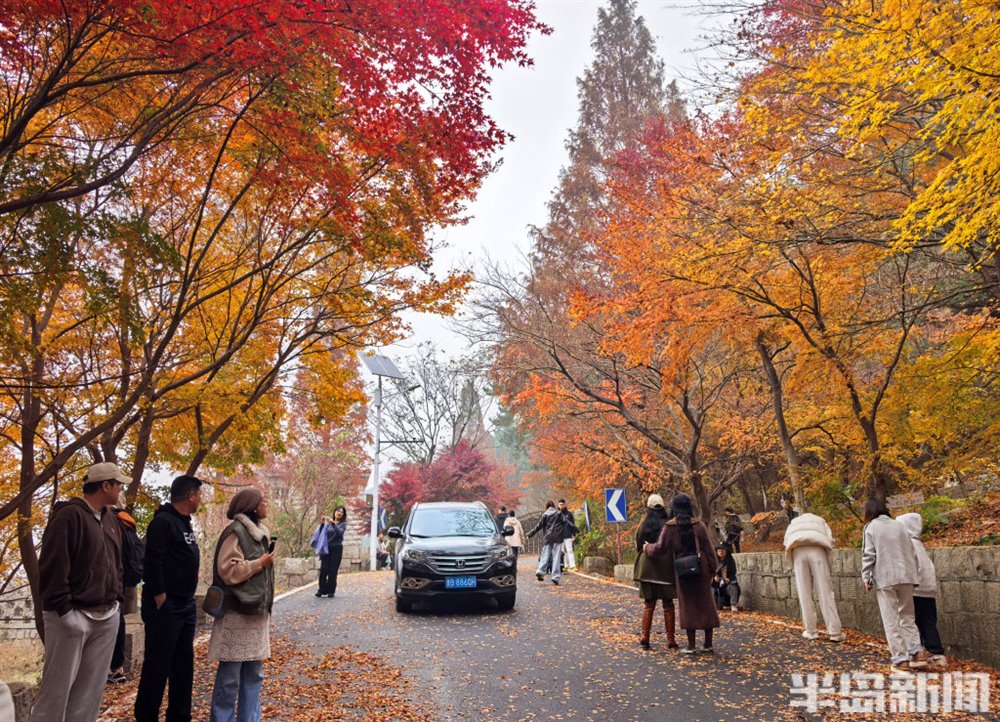 11 月 16 日,青岛崂山区北九水双石屋村社区的民国路热闹非凡,众多游客慕名而来,沉醉于道路两侧绚烂的五角枫美景中。