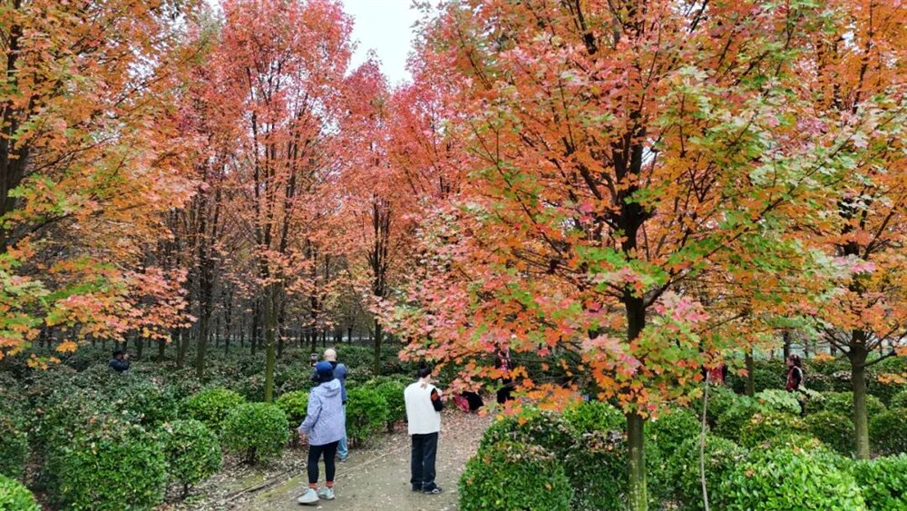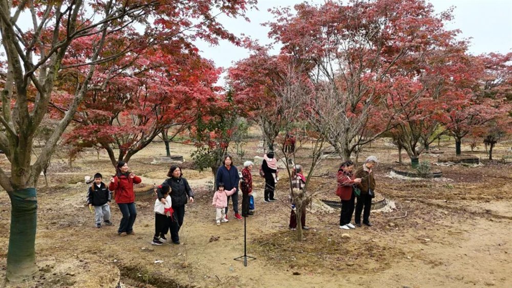 漫步林间,飘落的枫叶为大地铺就柔软“红毯”。市民游客或驻足树下,用镜头捕捉枫叶的灵动瞬间;或牵手家人漫步其间,踩着落叶感受初冬的温柔触感,欢声笑语在林间久久回荡。来自成都的杨雪不禁赞叹:“第一次来横山村,没想到这里的枫叶这么美,令人震撼,真是藏在‘深闺’的惊喜。”阿姨们在枫叶林中穿梭,裙摆与红叶共舞;摄影爱好者们架起“长枪短炮”,无人机穿梭其间,定格这层林尽染的绝美画面,“满山的枫叶,随手一拍都是大片!”