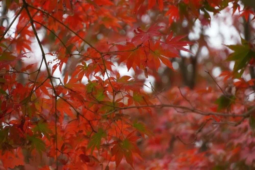 阳光穿透薄雾洒满山林,漫山红叶如火似霞、艳丽夺目。苍翠松柏与火红枫叶交相辉映,层次分明间相映成趣,勾勒出一幅意境悠远的冬日生态画卷。微风轻拂,枫叶摇曳生姿、沙沙作响,似低声吟唱着初冬的恋曲,尽显自然的灵动生机。山间溪畔,一簇簇红叶层层叠叠,璀璨迷人,随着昼夜温差的拉大,枫叶加快了变色的脚步,红黄色的过渡间,鹅黄、橘红、大红、紫红等色彩交织绽放,五彩斑斓如打翻的颜料盘,将初冬的韵味诠释得淋漓尽致。