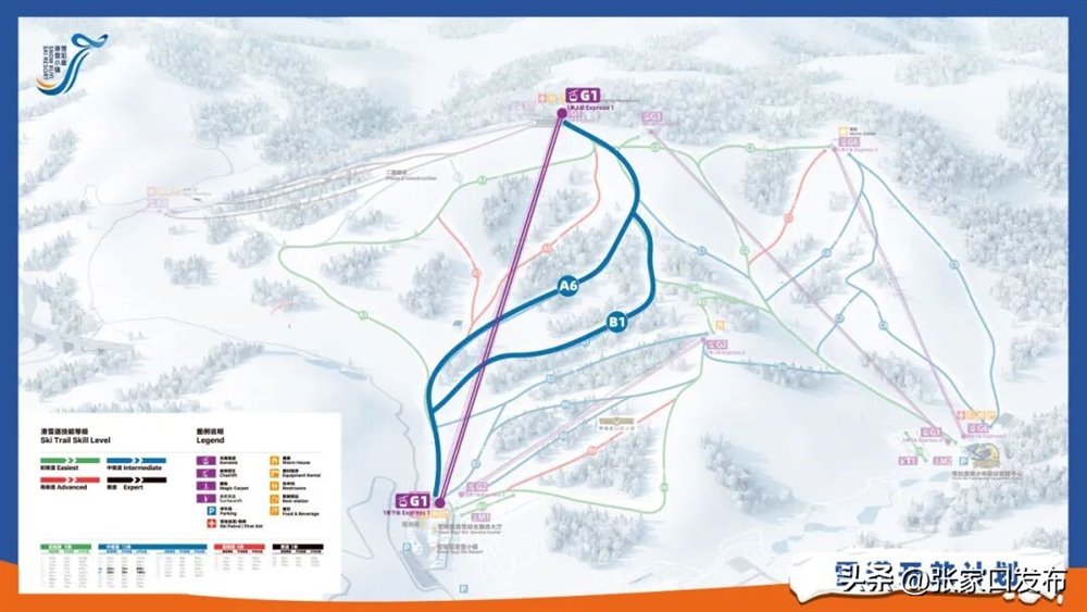 开放雪道中级道:A6、B1①A6雪道垂直落差265米,平均宽度53米,水平长度899米。②B1雪道垂直落差200米,平均宽度39米,水平长度1080米。