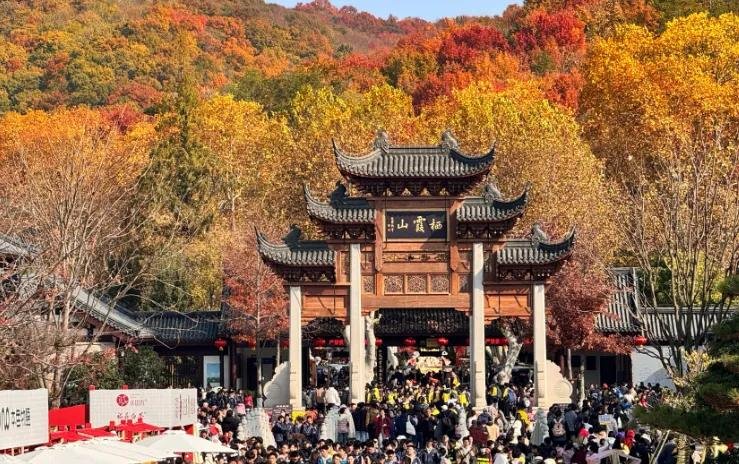 栖霞山与天平山的美各有千秋,如同金陵与姑苏的气质分野。栖霞山的红叶胜在气势,山间枫树品类繁多,鸡爪槭的艳红、枫香的绛紫、乌桕的橙黄交织在一起,形成层次丰富的色彩海洋。每到霜降之后,漫山红叶沿山势铺展,从明镜湖畔一直延伸到山顶的碧云亭,站在高处远眺,红浪翻滚,与山下的古寺飞檐、山间的石阶古道相映,连空气都仿佛被染成了温暖的色调,那份壮阔里藏着十朝古都的沉雄气度。