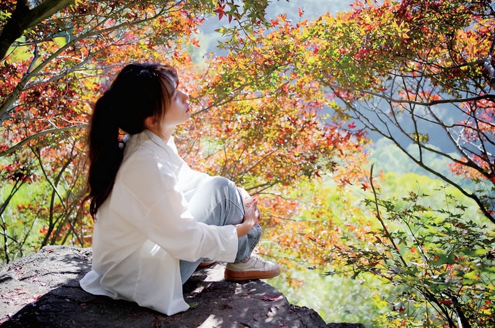 市民在东坪山登高欣赏五裂槭红叶美景。 晨报拍客 罗秀玉 摄