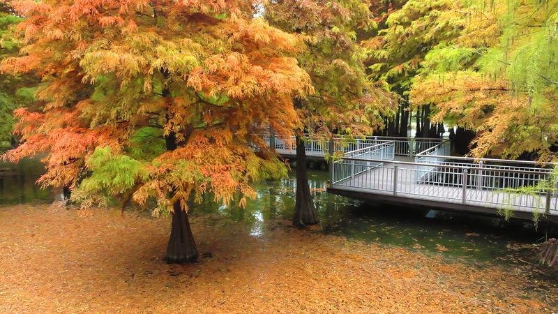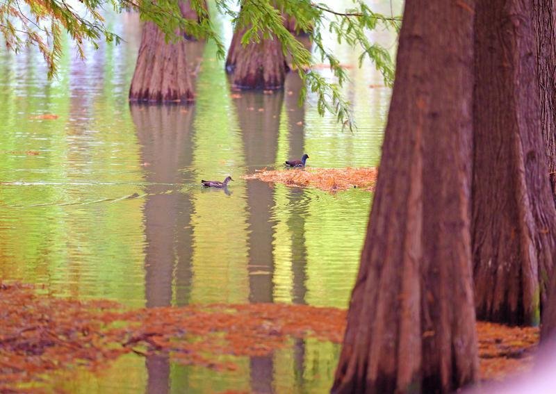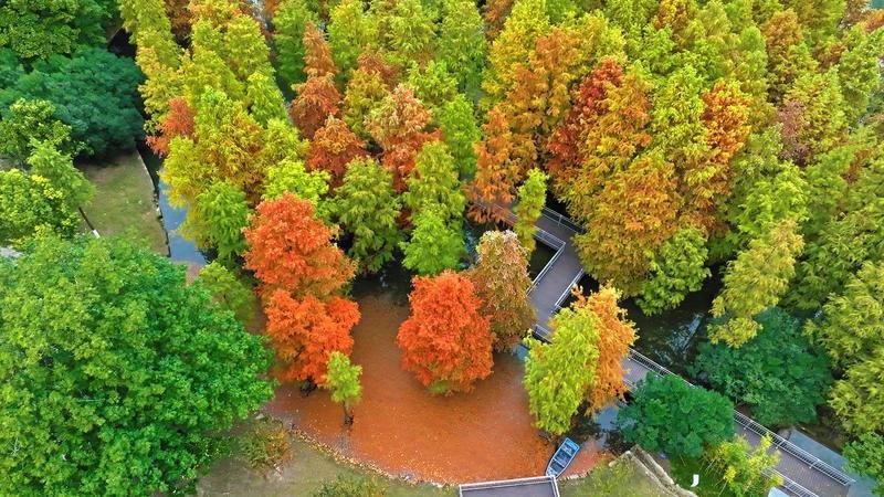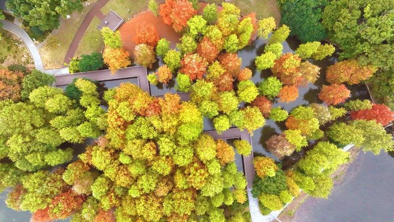 每年11月气温降至10°C左右时,落羽杉就进入一年中颜色最丰富的季节。杉叶会慢慢由绿转红,从半空俯瞰,就像是一幅缤纷绚烂的油彩画,成为翠竹公园秋色最为浓郁的区域。水面上蜿蜒的木栈道贴心地为市民游客设计了最佳观赏点,成群的小鸭悠哉地在水里游泳、嬉戏,随手一拍就是一幅秋季油画。当阳光透过树林,水光倒映着七彩调色的秋天,这一刻秋天有了具象化。