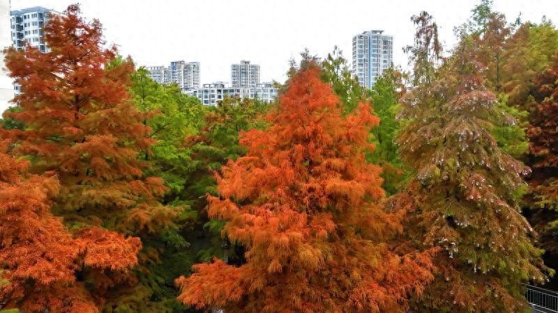 随着气温骤降,翠竹公园西南角的10亩墨西哥落羽杉林逐渐变色,将公园装扮得宛如童话世界一般。