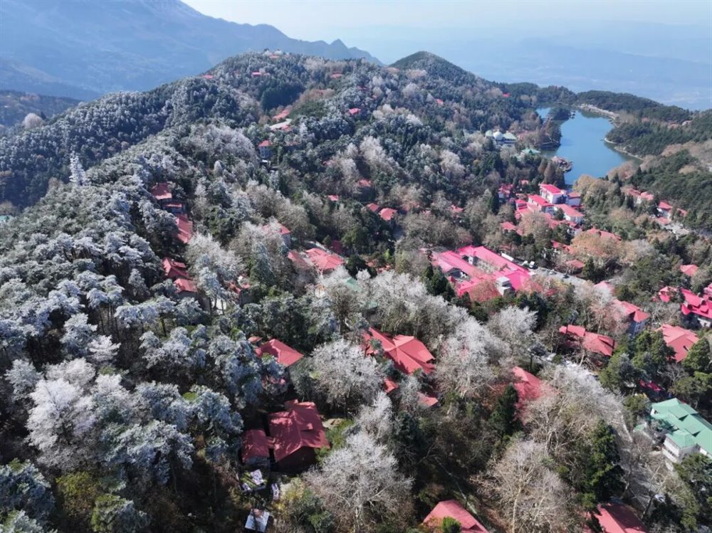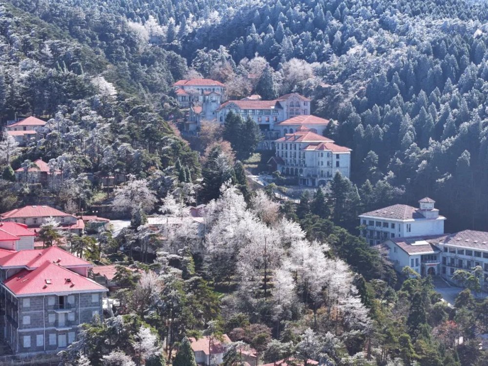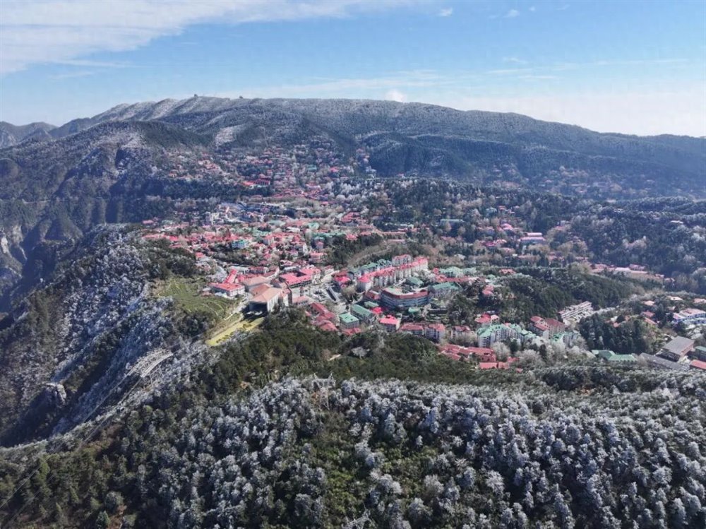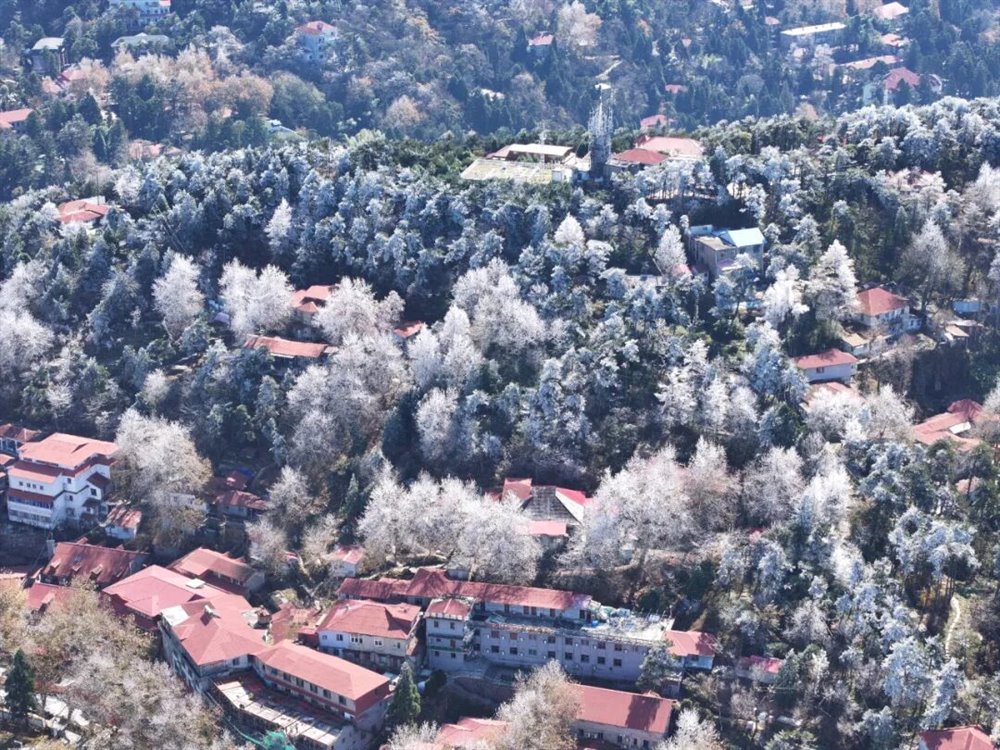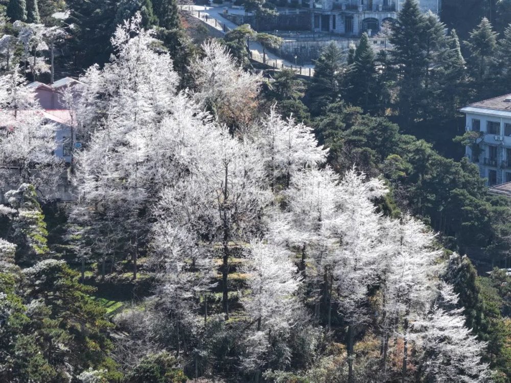 受北方冷空气南下影响,庐山景区迎来一次降温、大雾、大风天气过程。11月18日凌晨,牯岭镇最低温度降至-5℃。当天上午11时许,云雾渐渐散去,阳光透出云层,牯牛岭、大月山、土坝岭等高海拔山峰北坡林地“披挂”上晶莹剔透的雾凇,牯岭山城雾凇沆砀。