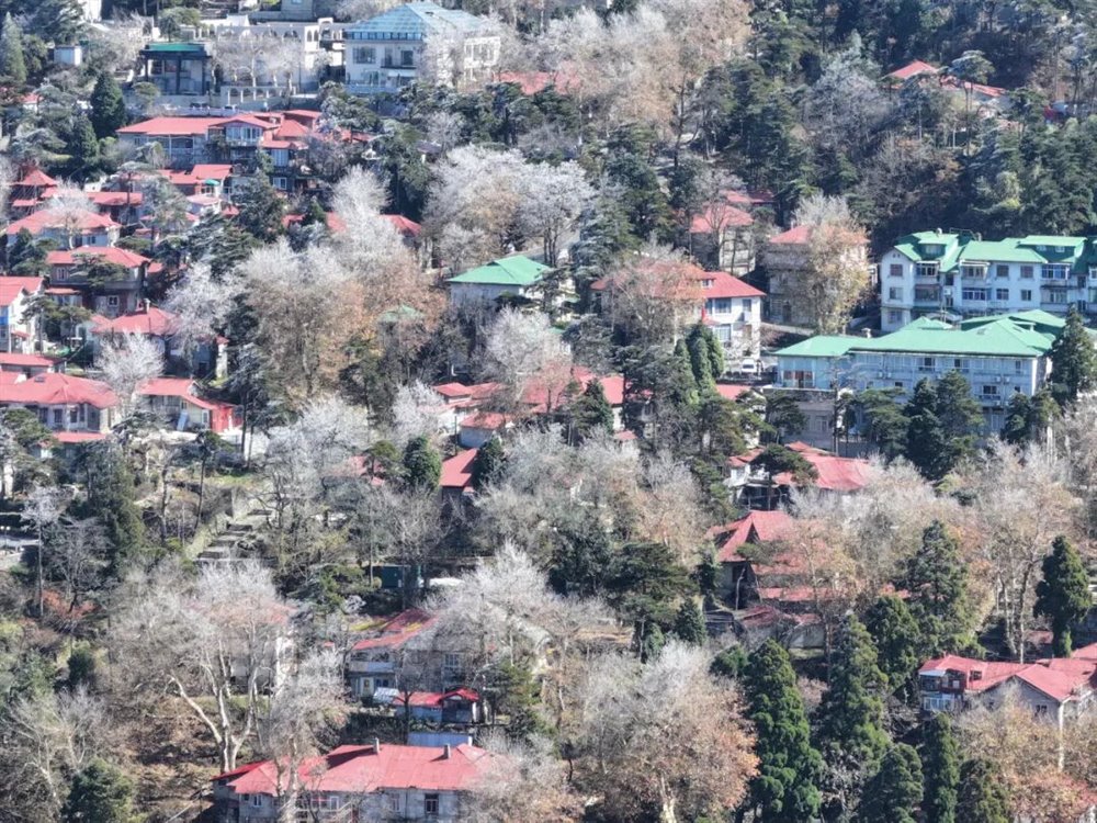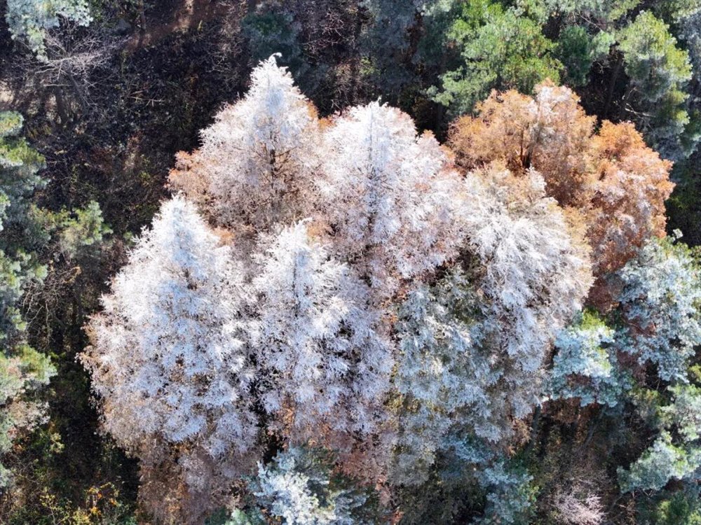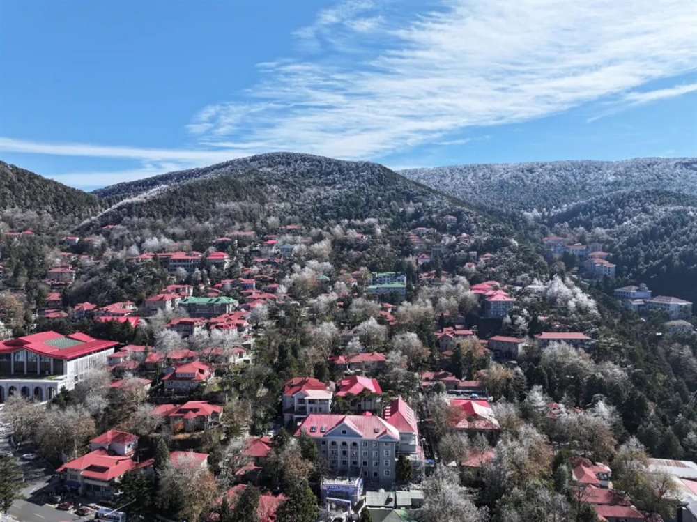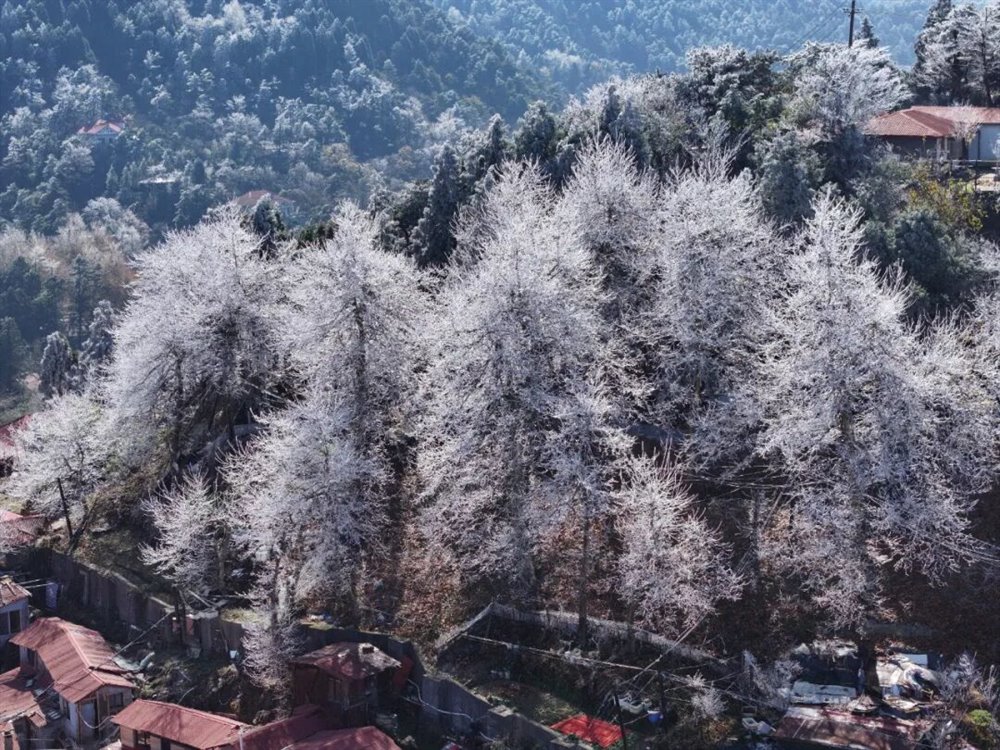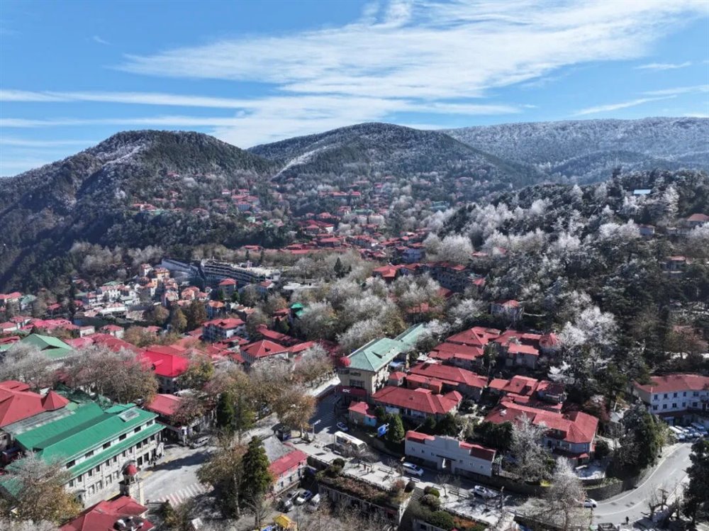 受北方冷空气南下影响,庐山景区迎来一次降温、大雾、大风天气过程。11月18日凌晨,牯岭镇最低温度降至-5℃。当天上午11时许,云雾渐渐散去,阳光透出云层,牯牛岭、大月山、土坝岭等高海拔山峰北坡林地“披挂”上晶莹剔透的雾凇,牯岭山城雾凇沆砀。