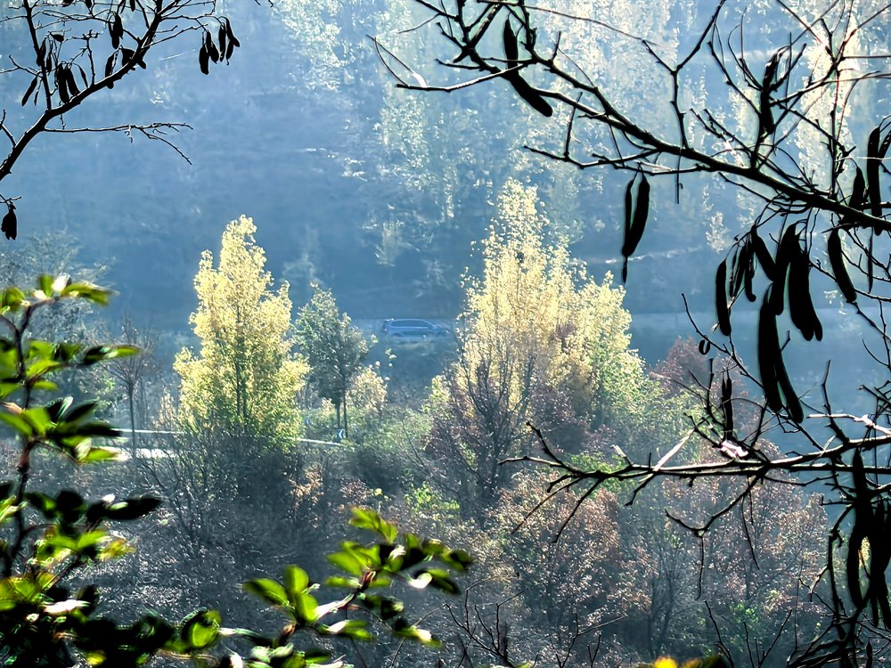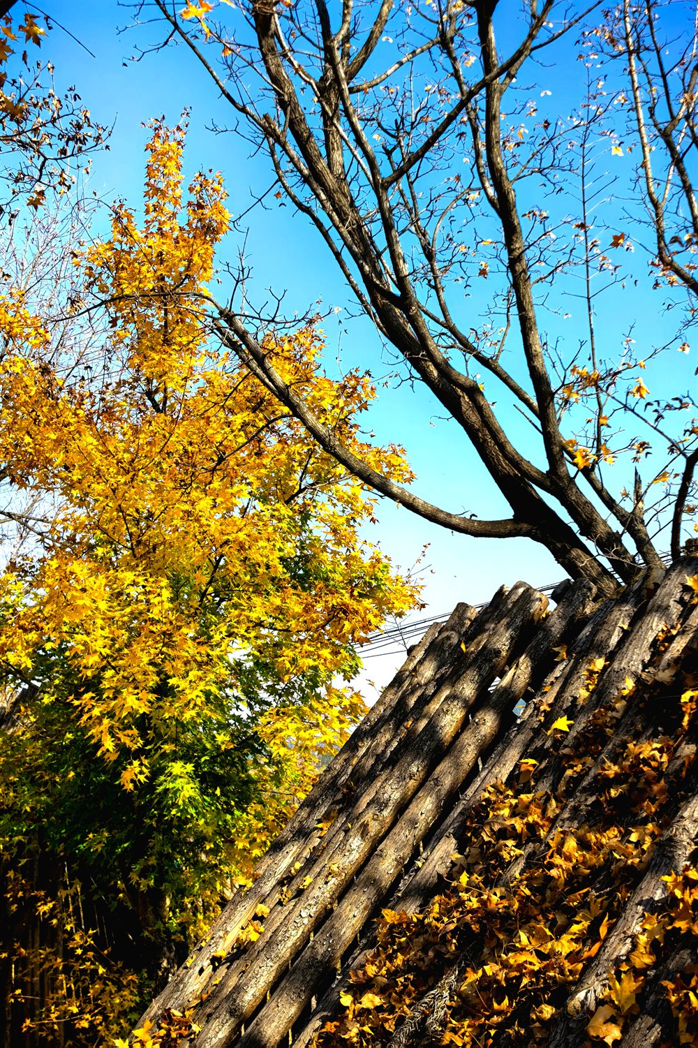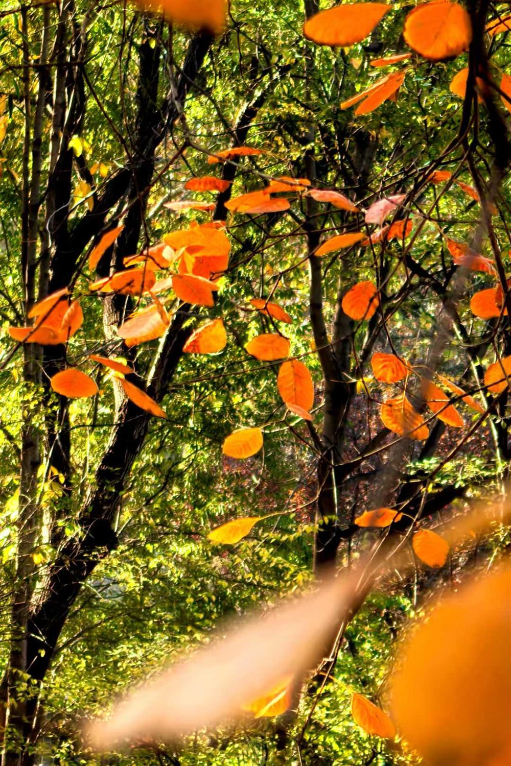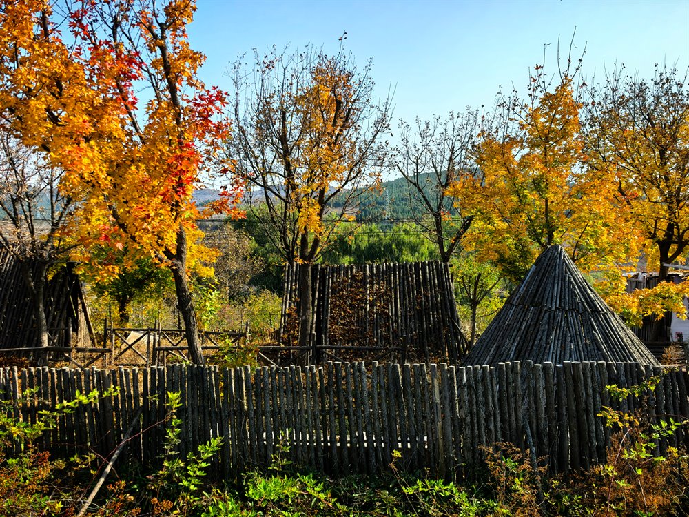 偶尔红黄相间的树下冒出几间木栅栏小屋