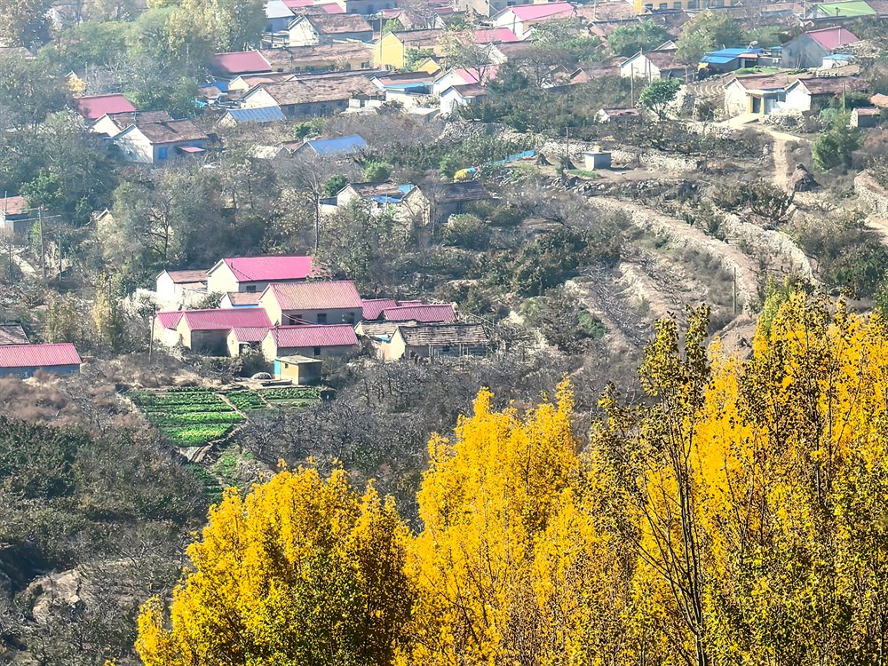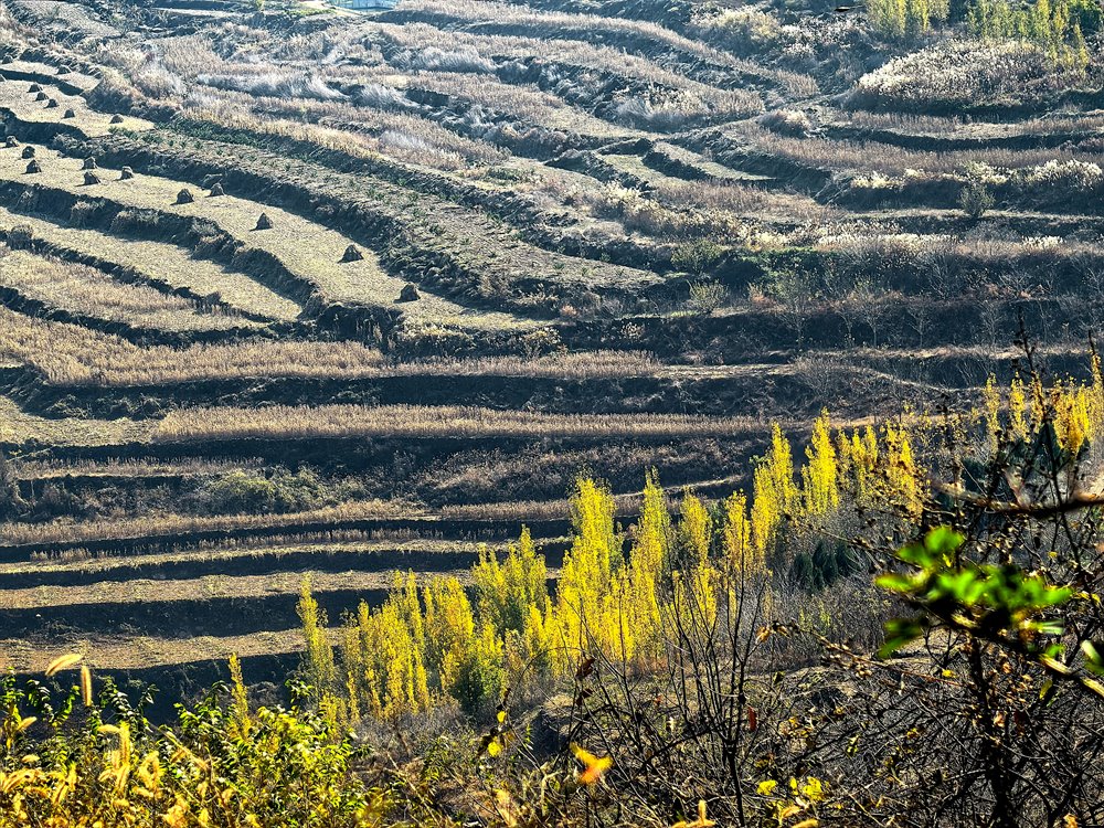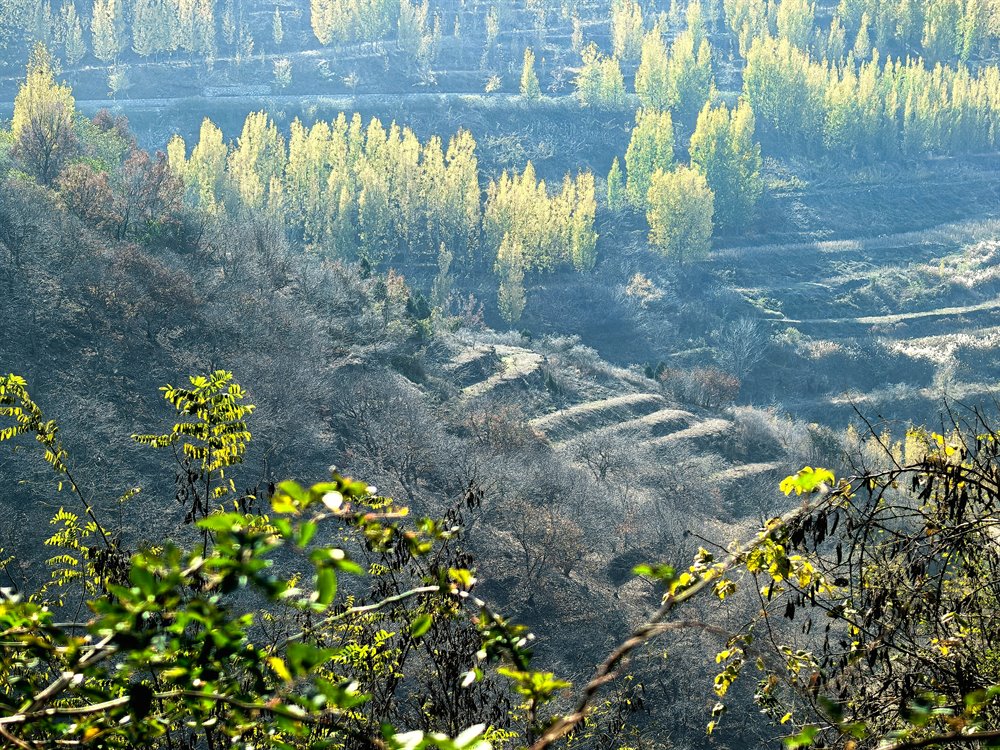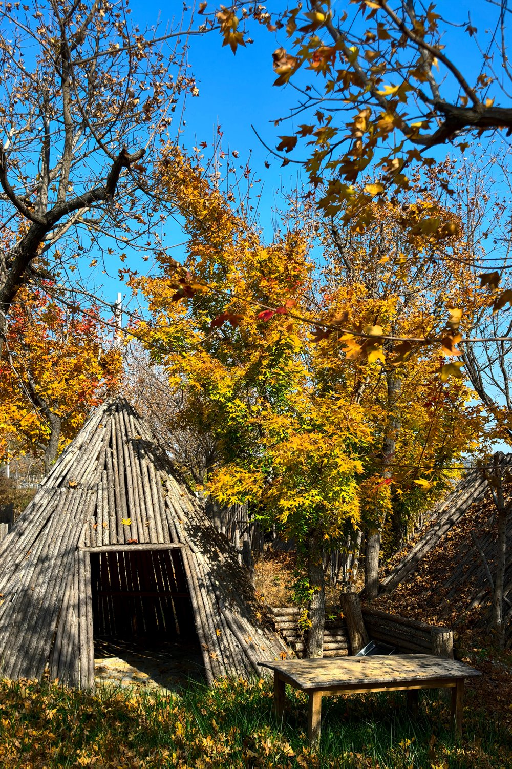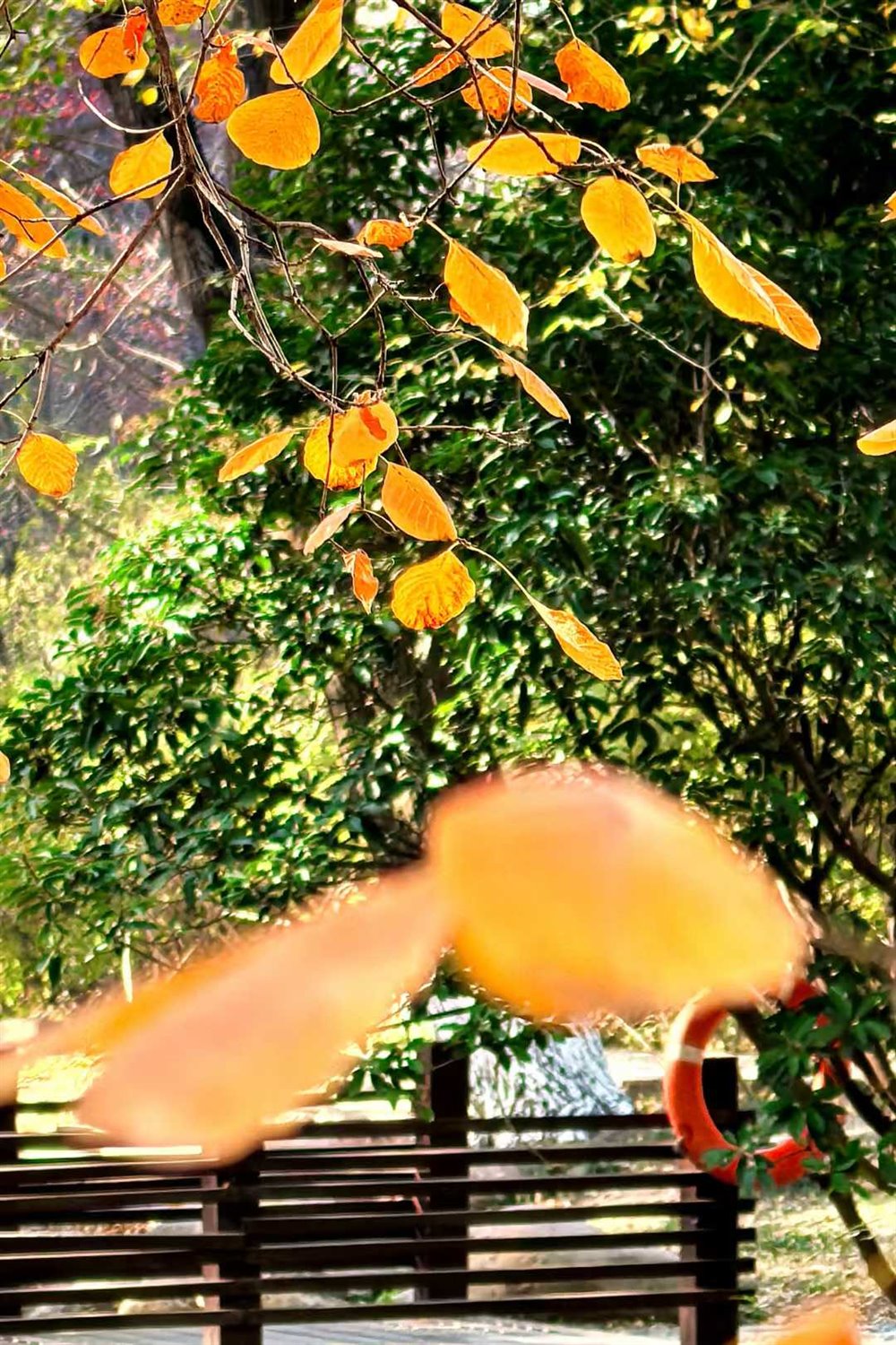 偶尔红黄相间的树下冒出几间木栅栏小屋