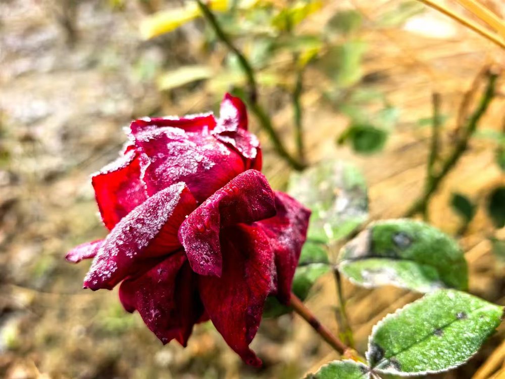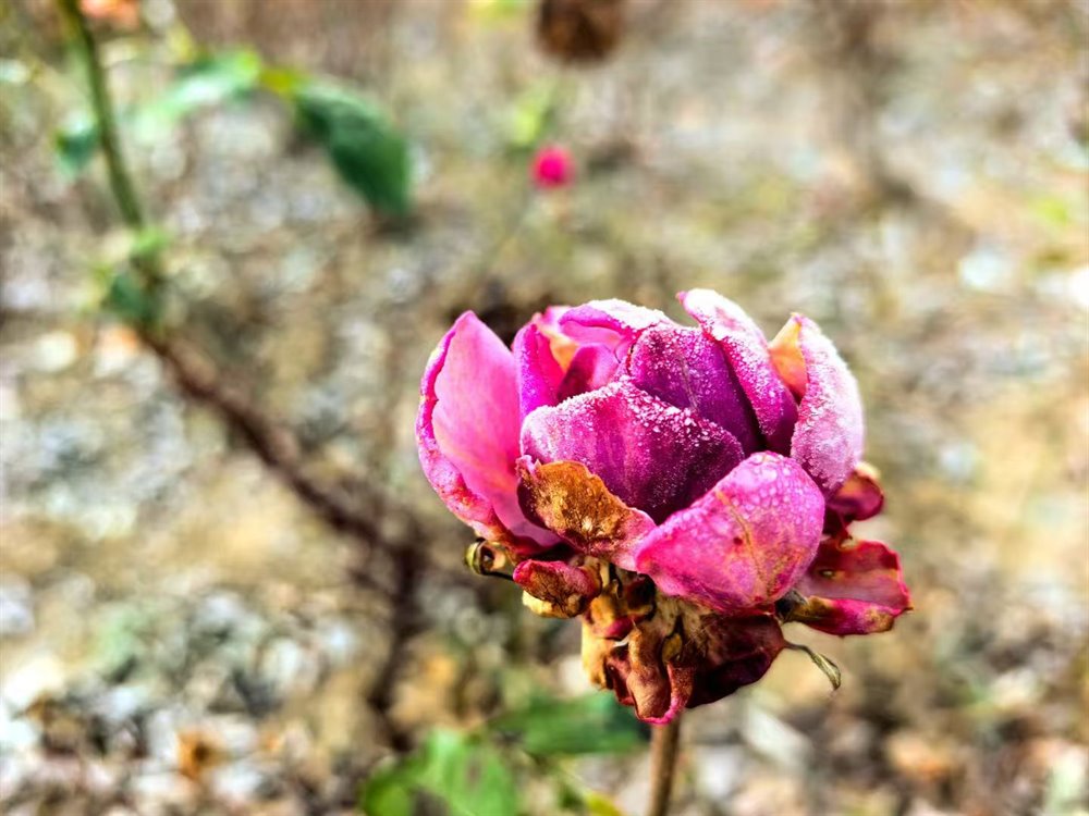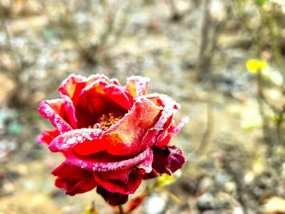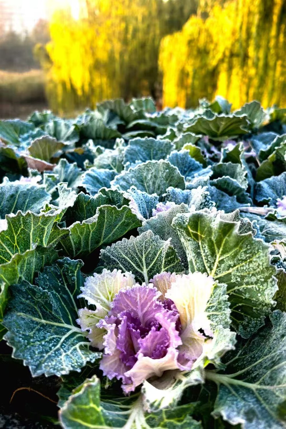 潍坊植物园的花朵裹着晶莹细碎的霜衣