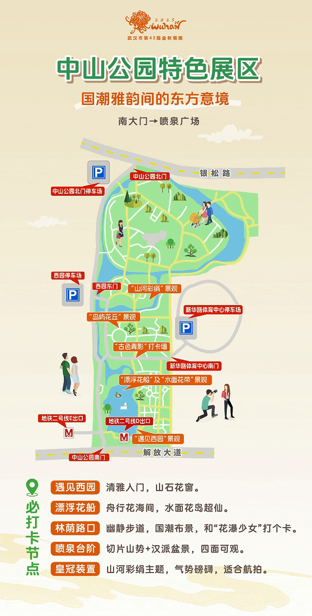 解放公园 中山公园 黄鹤楼公园 菱角湖公园 王家墩公园 月湖风景区 武汉园博园 武汉市民之家 马鞍山森林公园 西北湖绿化广场 三阳路地铁A、H口 归元寺/晴川阁/宝通寺 台北路天桥/江大路天桥 华中科技大学西十二/华中师范大学/武汉大学 枫叶火红