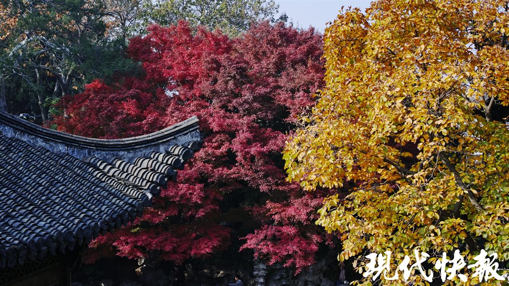 现代快报讯(记者 顾潇)初冬时节,层林渐染,正是赏红叶的好时候。在扬州众多赏红叶的去处中,晚清第一园——何园水心亭旁的鸡爪槭热度最高。11月25日,现代快报记者探访发现,这株鸡爪槭已迎来最佳观赏期,在古典园林的雅致景致中,绽放出绚烂光彩。