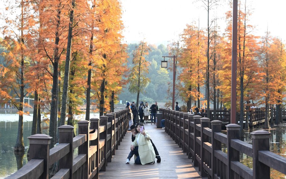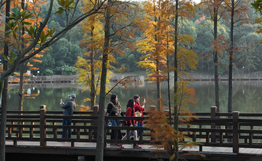 11月23日,游人在宜春中心城区北湖公园观光游玩。初冬时节,公园内的水杉树悄然换装,成为冬日里一道亮丽风景,吸引不少游人拍照打卡,记录这份限定的温暖与惬意。易志钟 文/图