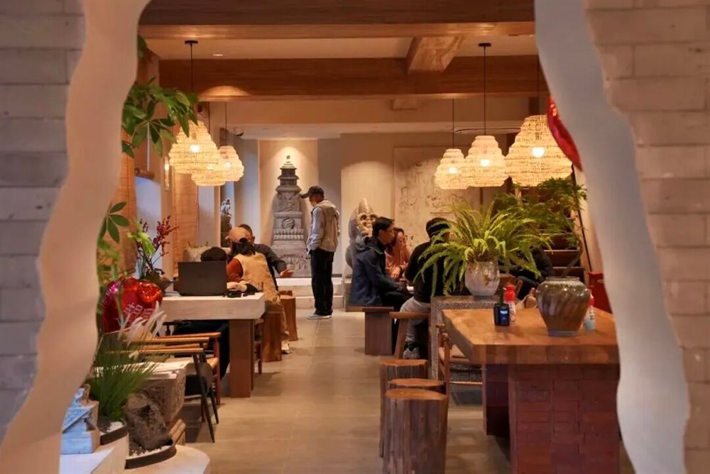 逛累了,隔壁的主题茶饮空间正飘来温润茶香,装点着原木、石桌、砖雕的茶室中,大有返璞归真、天然去雕饰之感;邻座茶席间,茶香氤氲,杯中倒映着窗外的灰瓦,创意饮品搭配现烤手作糕点,味觉与视觉,在这一刻悄然相通。