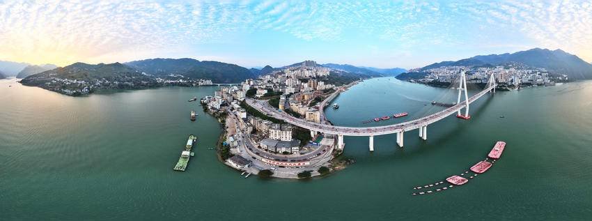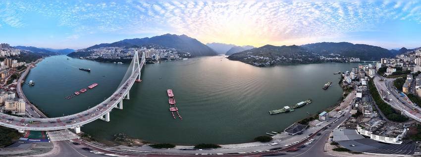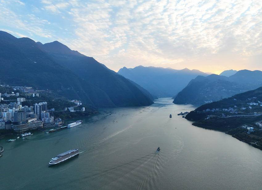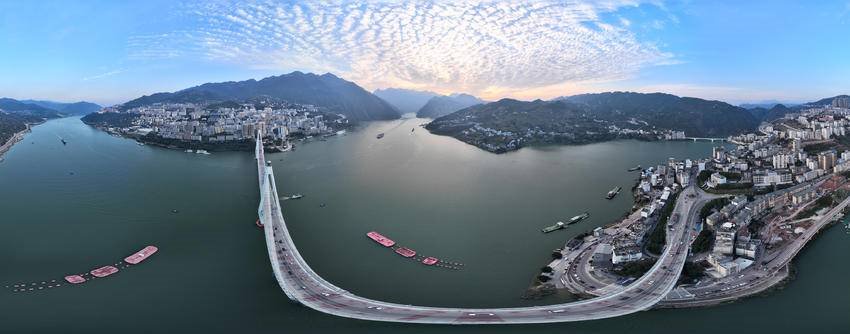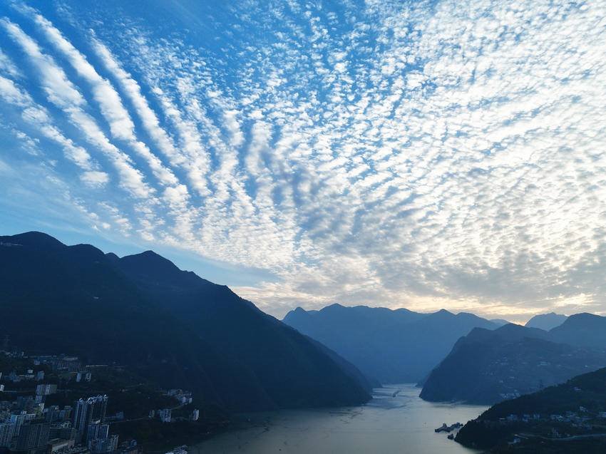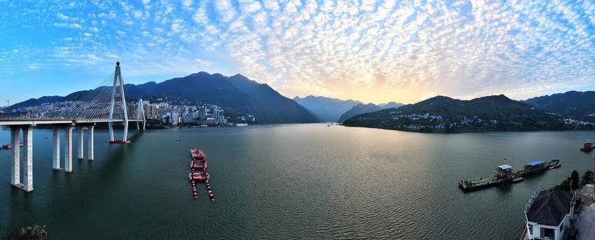11月23日,巴东县长江巫峡口天地间正在进行一场无声的告别演出,冬日暖阳与晚霞余晖呈现的蔚蓝、赤红、金橙、淡紫、暗褐在天际交织辉映,像是画家打翻的调色盘,五彩斑斓,把大地、山川、河流、桥梁、建筑等渲染得如诗如画,仿佛入了仙境之地。