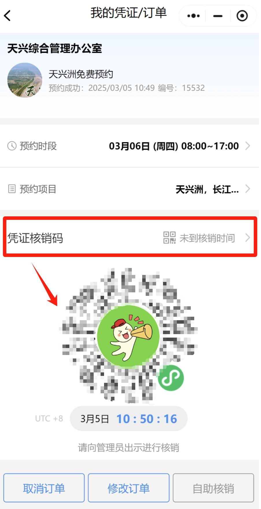 2. 天洲大桥上设有进洲卡口(下图所示螺旋道处大概就是下洲口)。进入预约小程序,点击“订单凭证”找到预约码,现场工作人员扫码核销即可进洲。