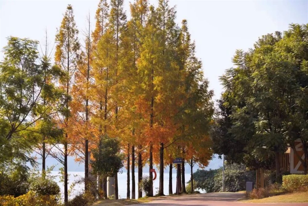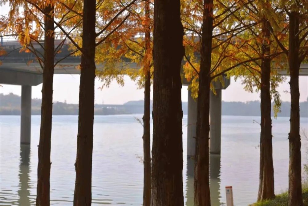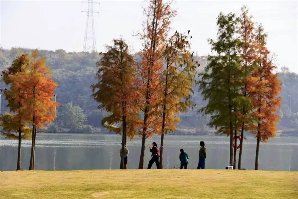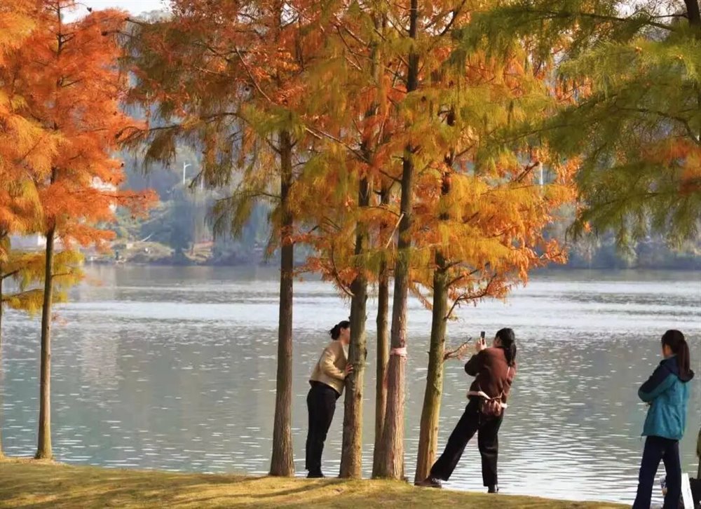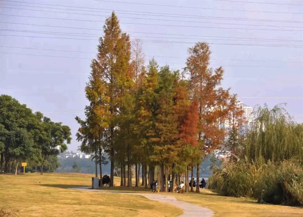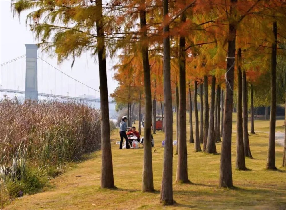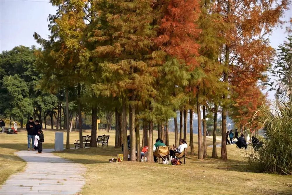 眼下正值水杉的最佳观赏期,不少市民专程前来此处,在水杉树下喝茶、晒太阳、拍照,享受流水潺潺伴着一杯清茶带来的慢时光,悠然而惬意。