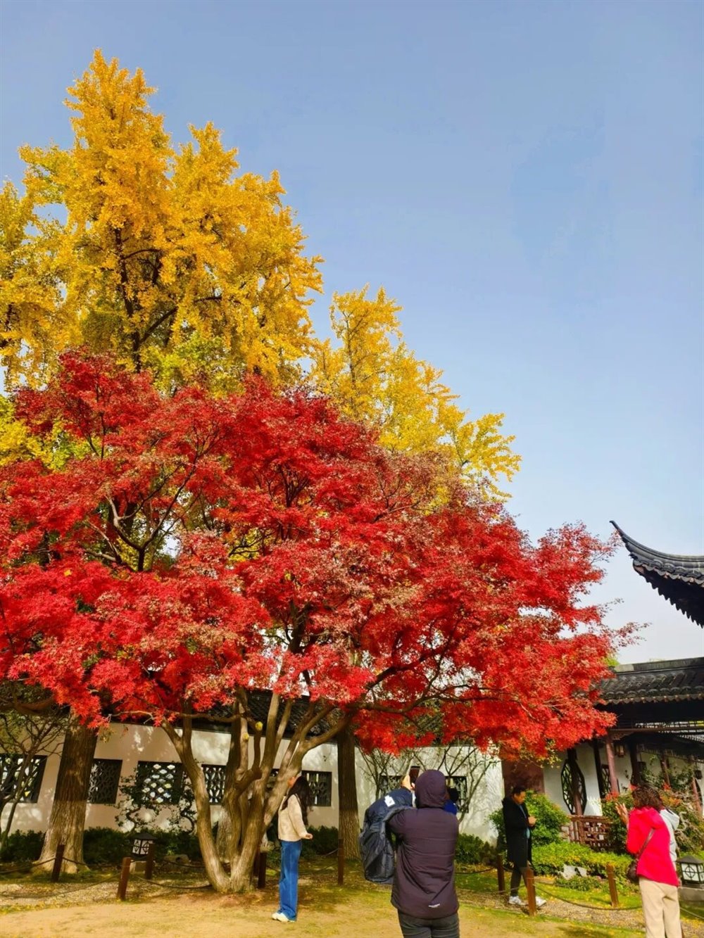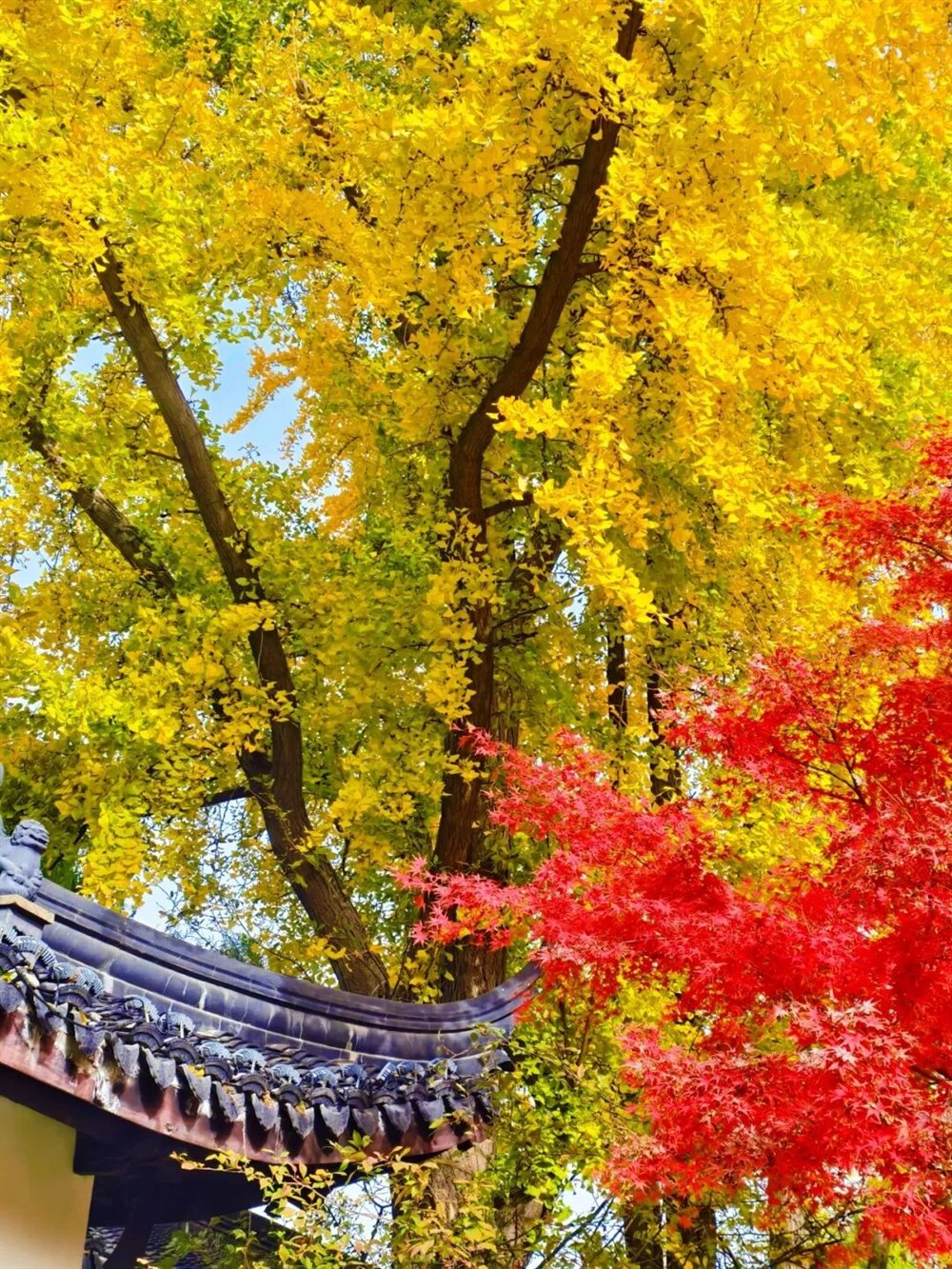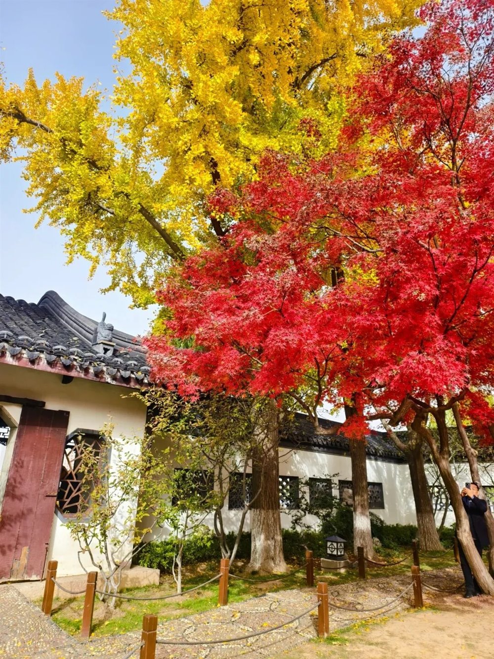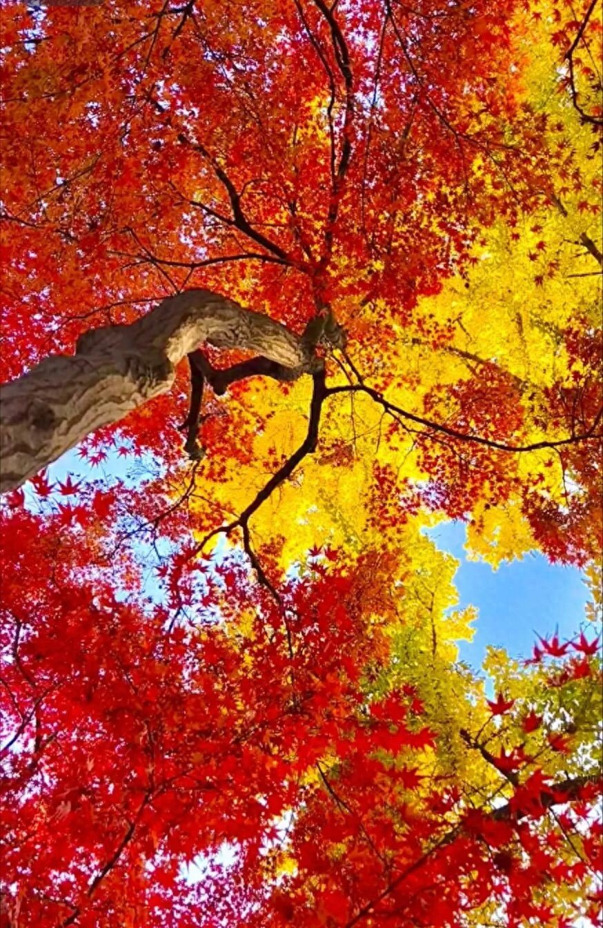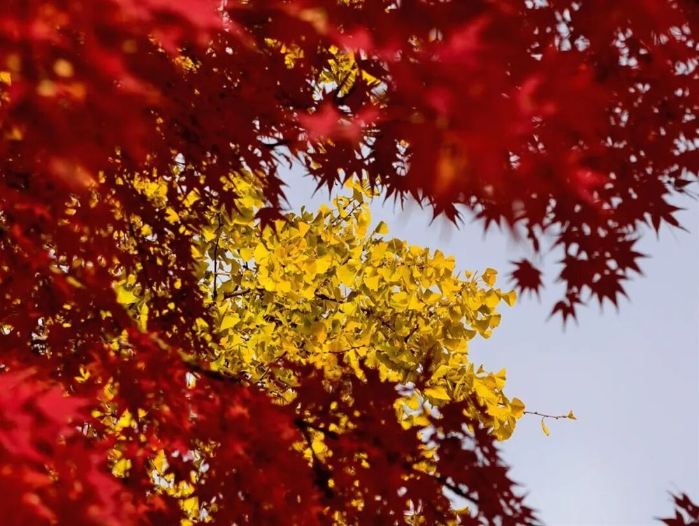 身旁的枫树则燃着满腔热烈,掌状的叶片红得浓烈,似烈火燎原,又似晚霞倾泻。