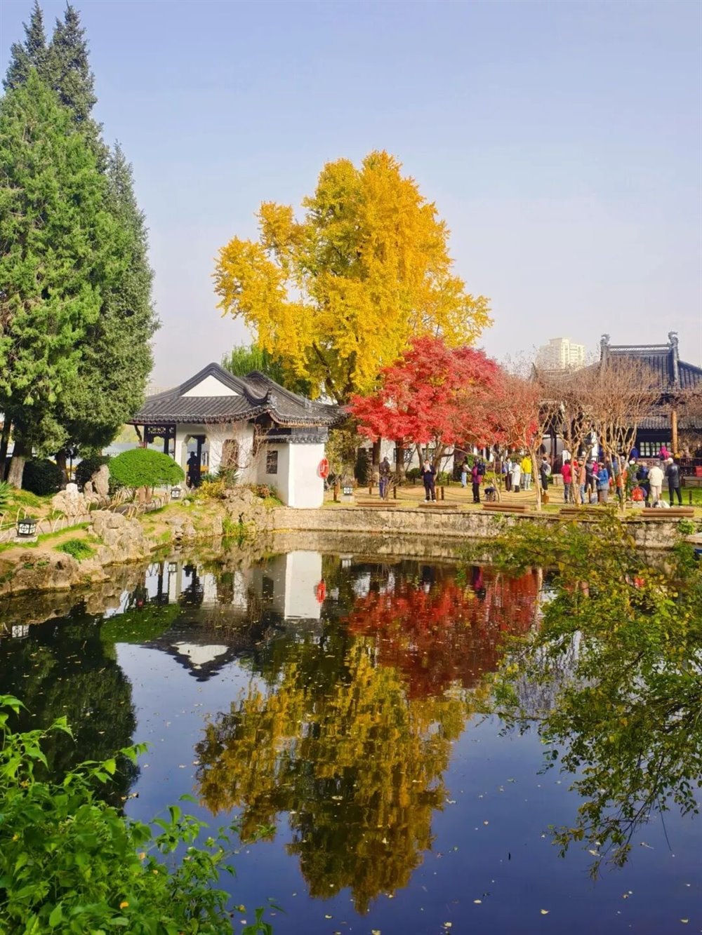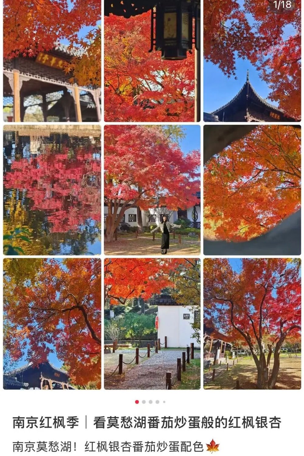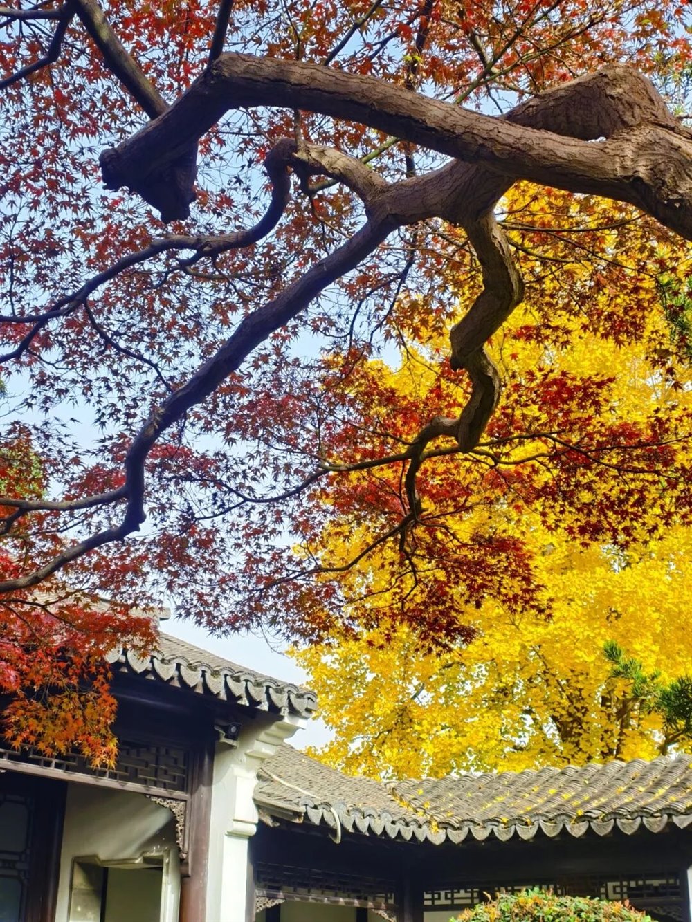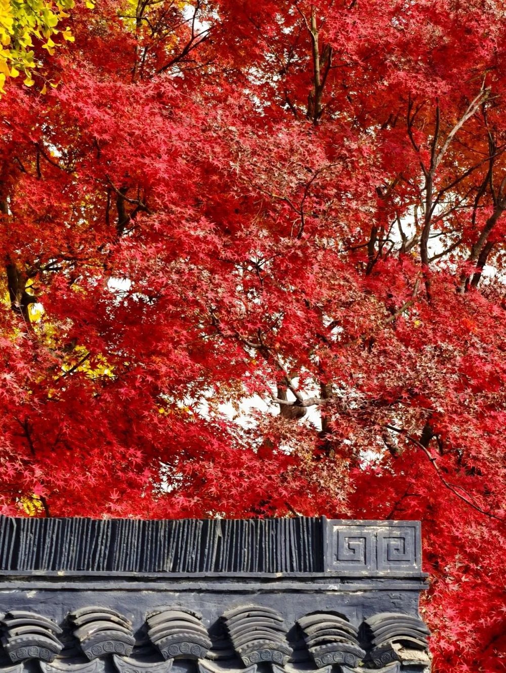 身旁的枫树则燃着满腔热烈,掌状的叶片红得浓烈,似烈火燎原,又似晚霞倾泻。