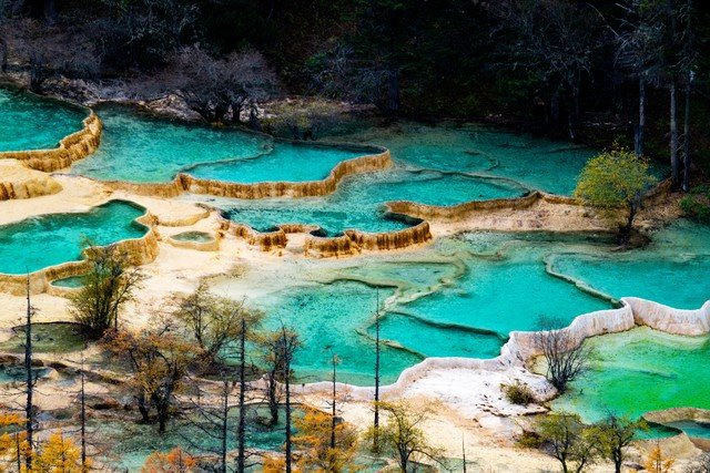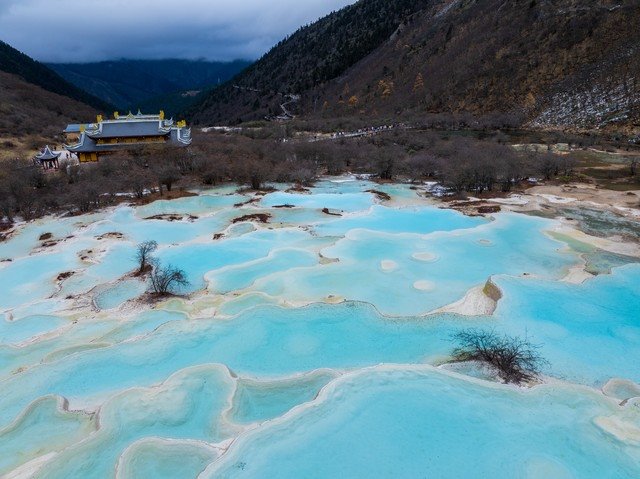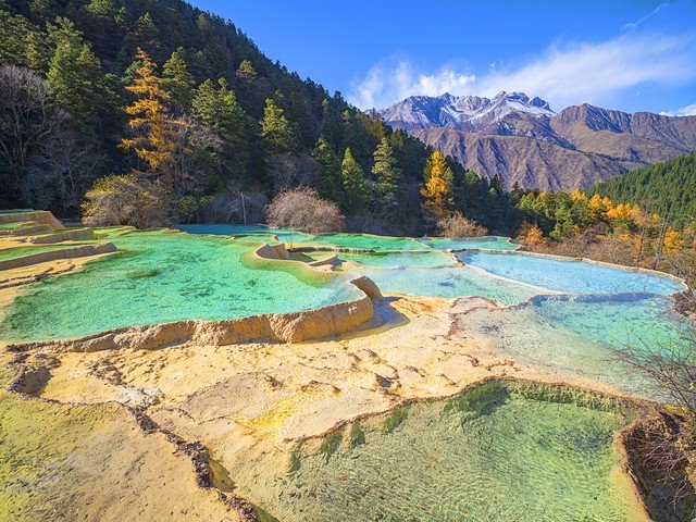 黄龙风景名胜区位于四川省阿坝藏族羌族自治州松潘县,以其壮丽的彩池、雪山、峡谷和森林闻名于世,被誉为“人间瑶池”。这里是中国唯一的保护完好的高原湿地,海拔在3000米以上,涵盖了众多的雪山、冰川、峡谷和森林等景观。