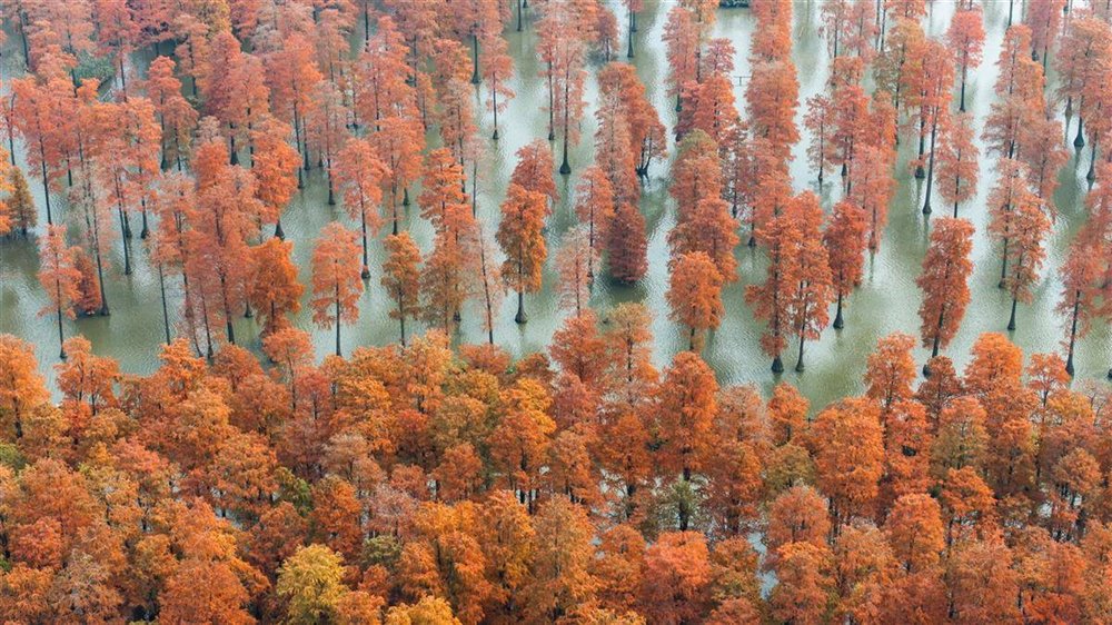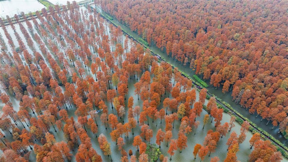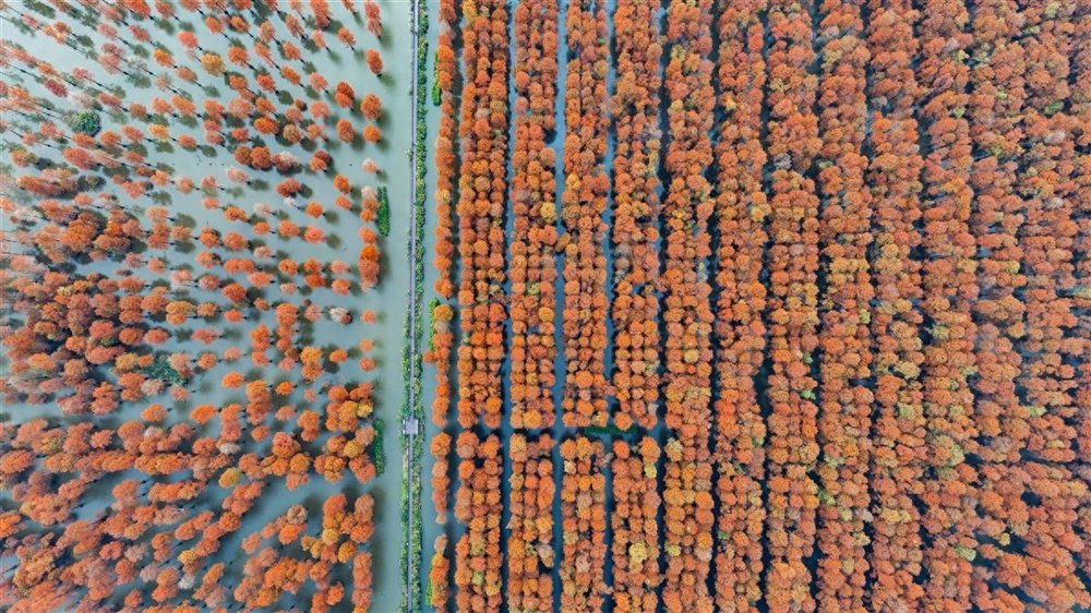 2025年12月2日,武汉市新洲区涨渡湖湿地森林公园里,10000余株池杉树叶陆续变红,阳光穿过树林,宛如童话世界。近年来,涨渡湖生态环境体系逐渐恢复,湿地内共有珍稀濒危保护植物5种,国家重点保护动物有9种,国家I级保护动物2种,国家II级保护动物13种。(湖北日报全媒记者 何宇欣 实习生 曹若妍 陶晨曦 摄)