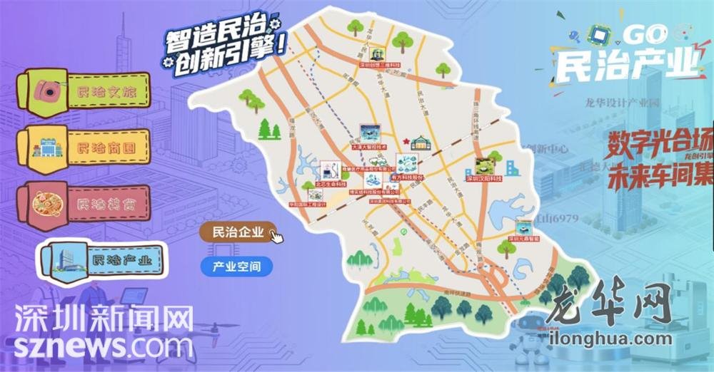 民治企业——展示辖区重点企业与创新机构,呈现民治的经济活力;民治空间——介绍产业园区、办公空间等载体,助力企业选址与发展。