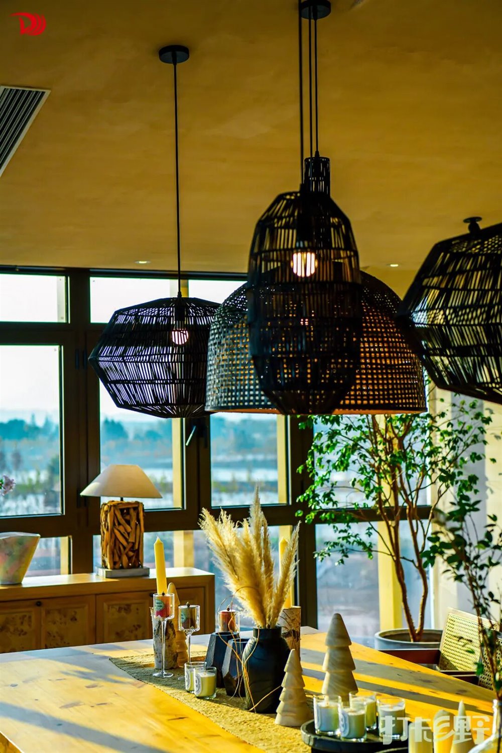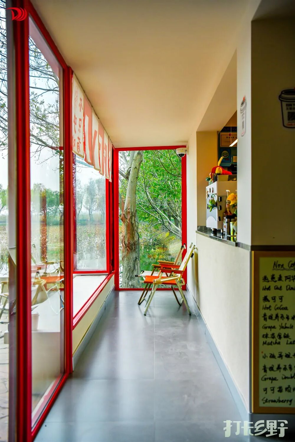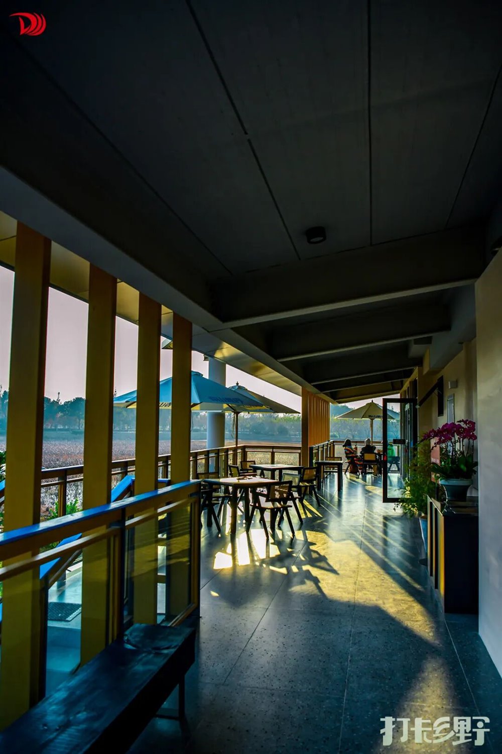 如果追求更静谧的观景体验,可以来“春山无界”。店内环境很舒适,一看店主就是很有想法的人,室内设计巧思很多,木质框架+全景窗,抬头是蓝天,低头是荷塘残荷,连风里都裹着泥土味。