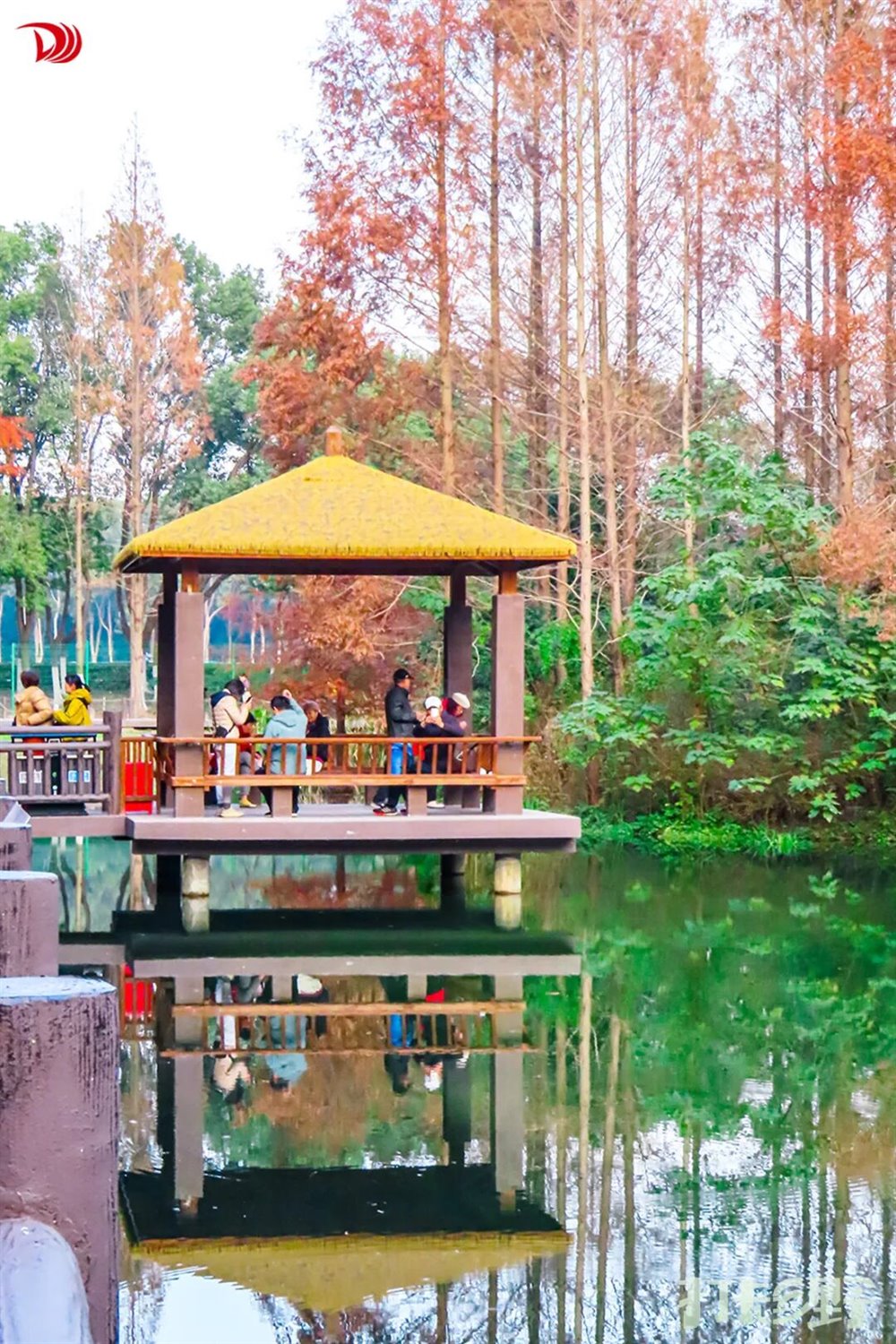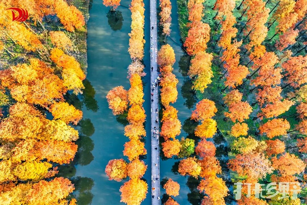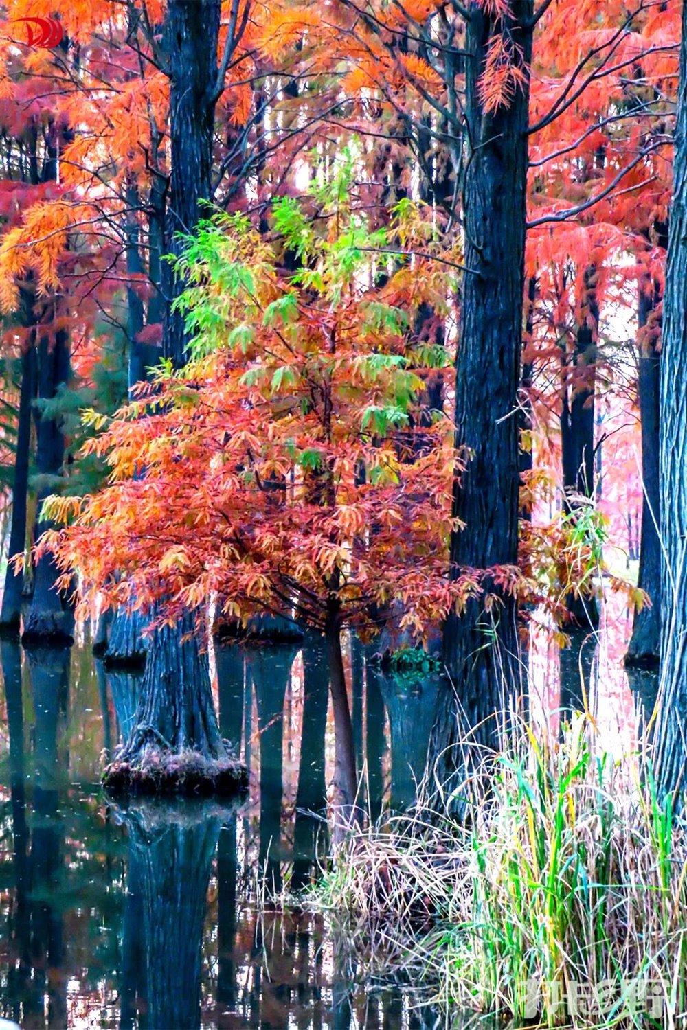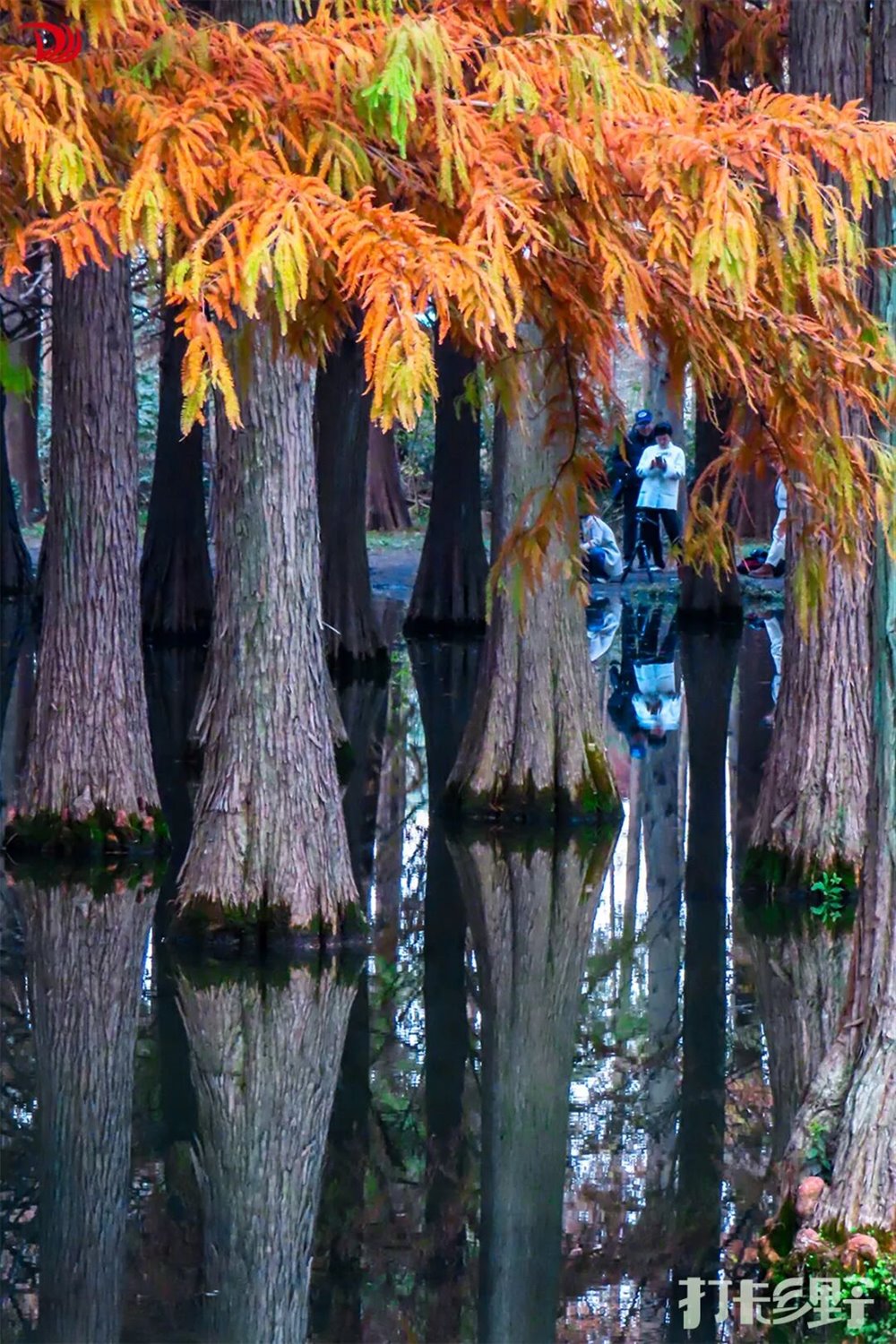 进入12月,池杉林全面浸染为绚丽的朱红色,赭红与深棕占据了全部视线。它们不是长在岸上,而是直接扎根在浅水中,树影、红杉、碧波与天空的倒影交织,像打翻了的调色盘浸在水里,视觉效果直接封神。