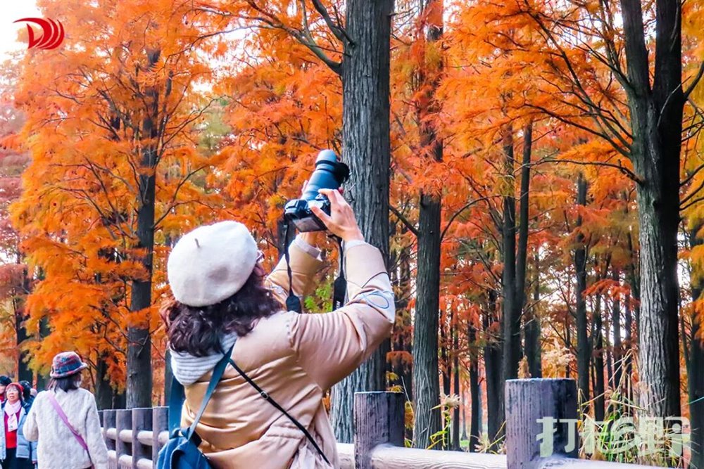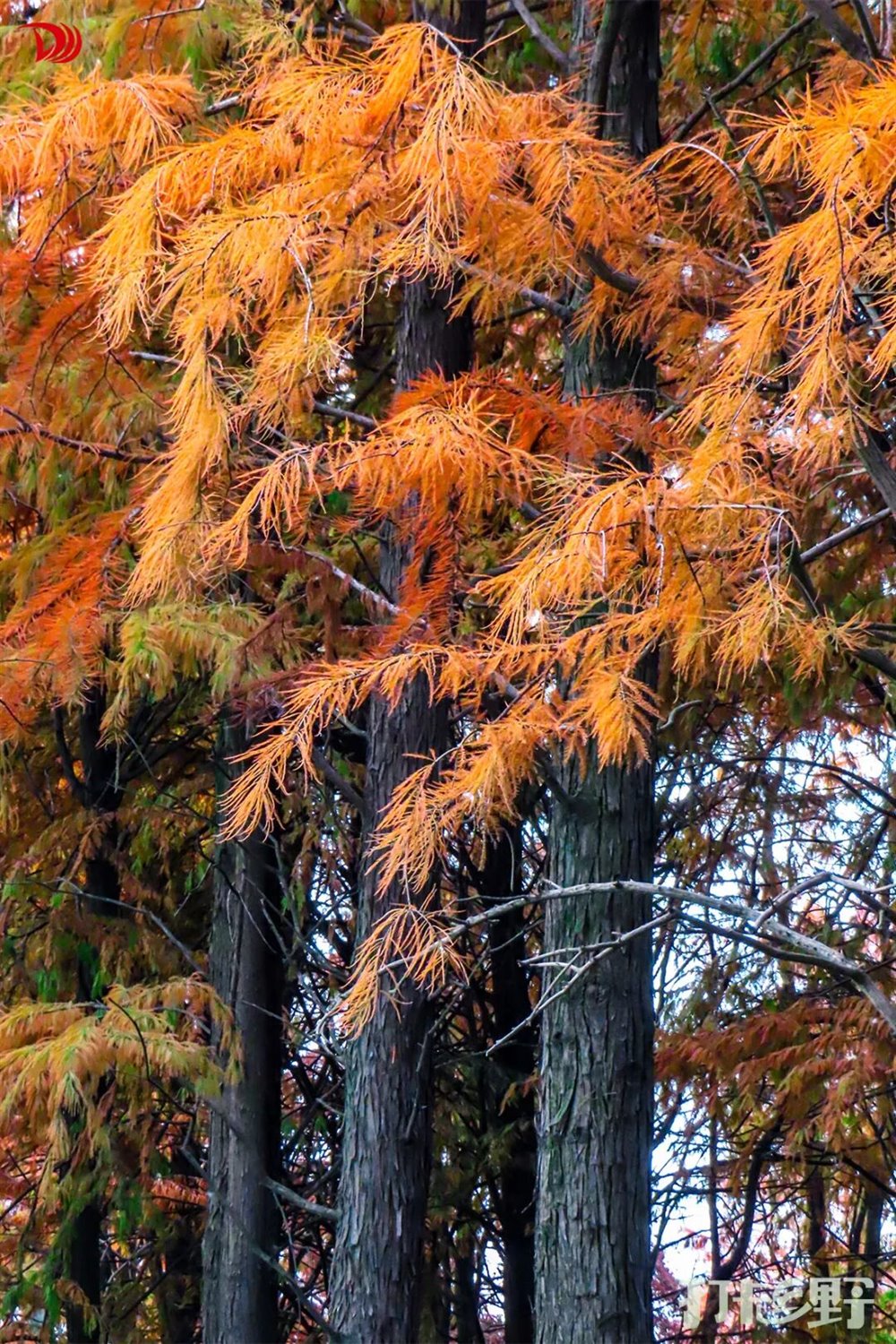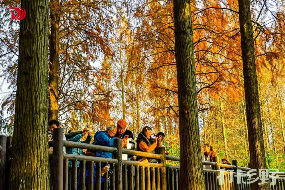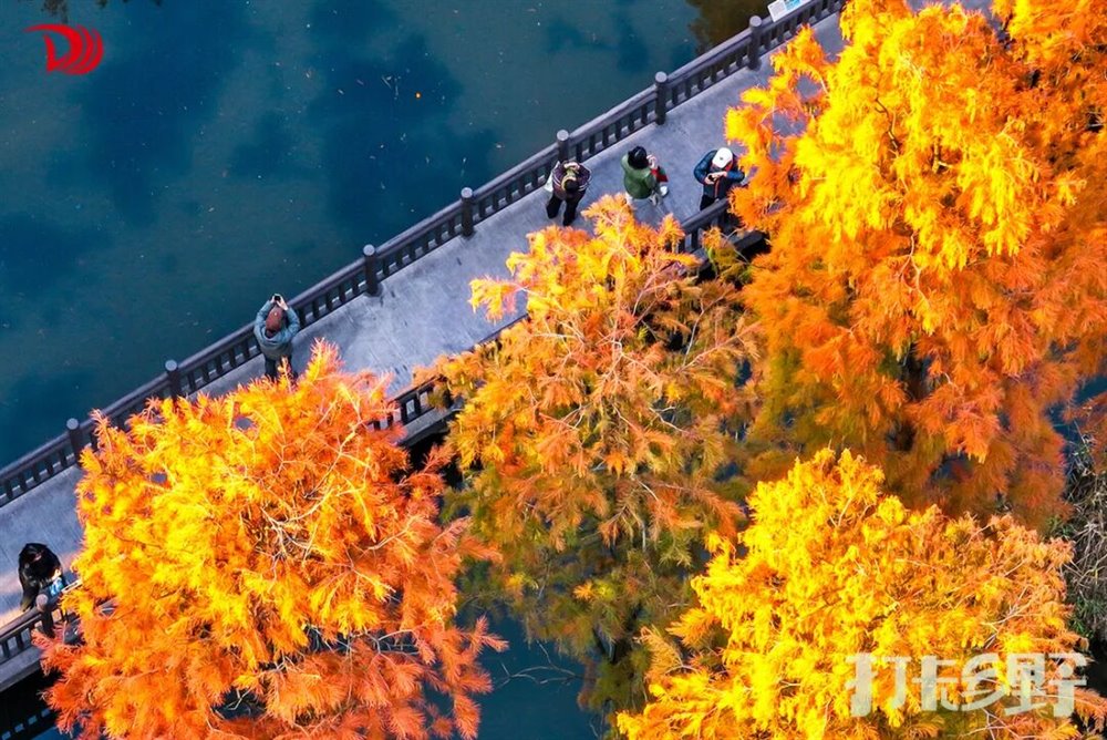 进入12月,池杉林全面浸染为绚丽的朱红色,赭红与深棕占据了全部视线。它们不是长在岸上,而是直接扎根在浅水中,树影、红杉、碧波与天空的倒影交织,像打翻了的调色盘浸在水里,视觉效果直接封神。