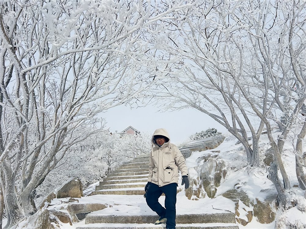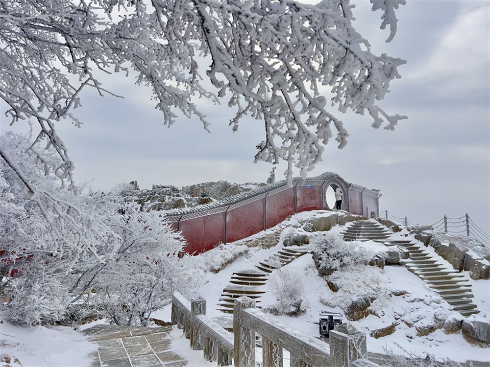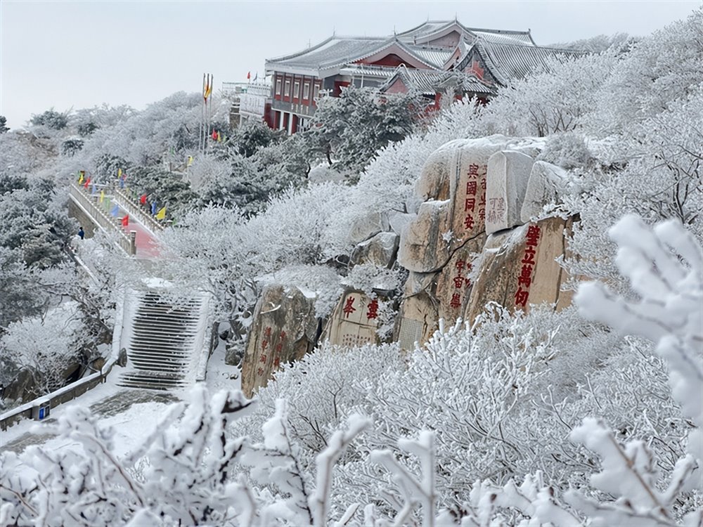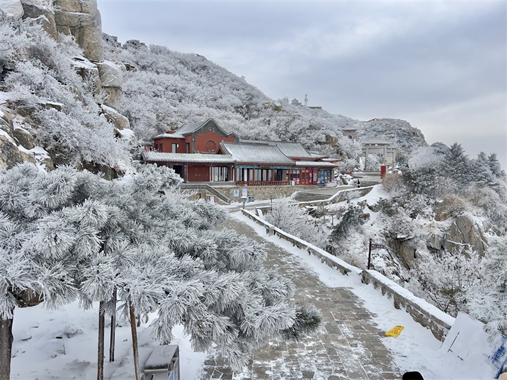 泰山晚报讯 12月23日,雪后的泰山宛如冰雪童话世界。山间树木挂满雾凇,琼枝玉叶晶莹剔透,与红墙黛瓦的古建筑相映成趣,石阶古道覆着薄雪,一步一景皆成诗。