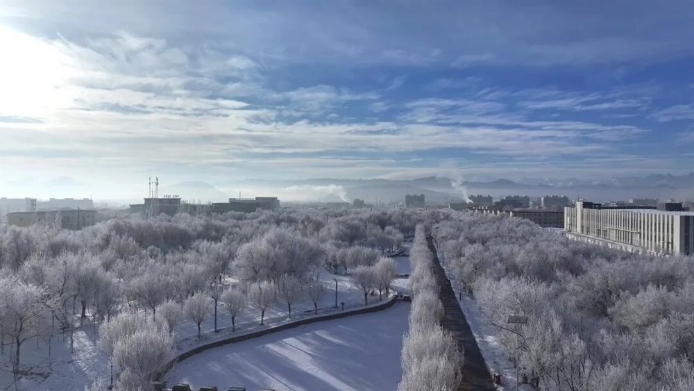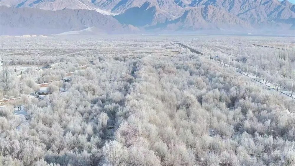 “夜看雾,晨看挂”,低温与雾气的邂逅让乌恰的草木换上洁白绒衣。琼枝玉叶间,霜花轻摇,阳光洒落时银光闪烁,呼吸间皆是清冽的冬日气息。