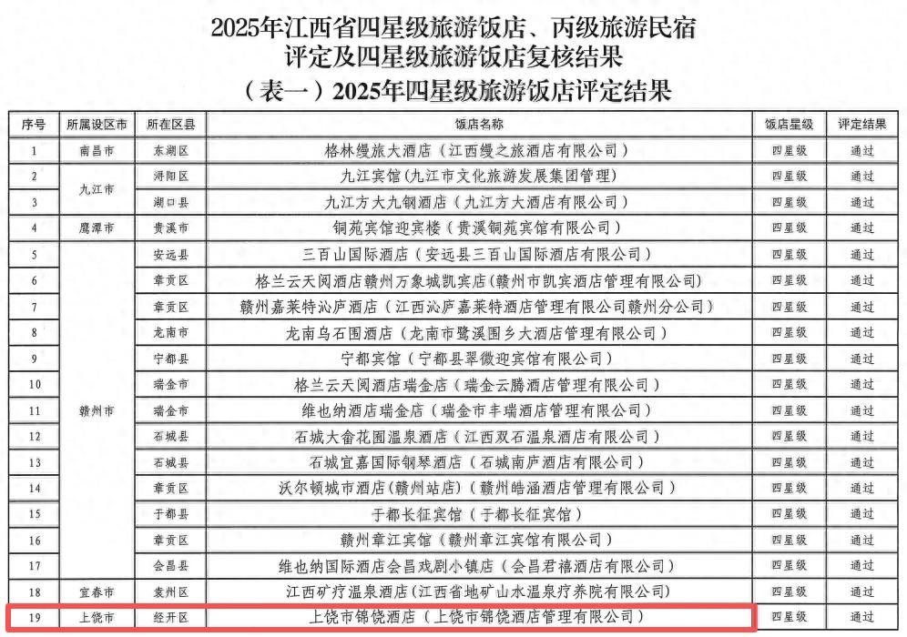 近日,经过江西省旅游星级饭店评定委员会评定,上饶市锦饶酒店(维也纳国际酒店经开区店)获评四星级旅游饭店。