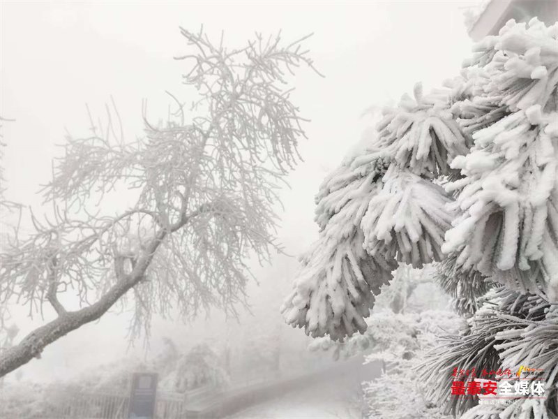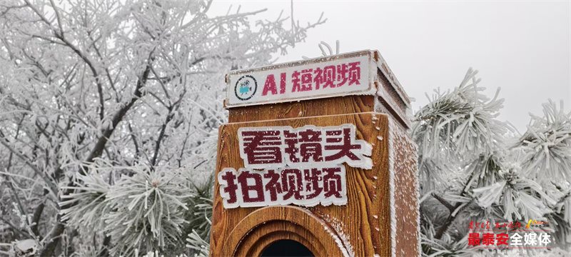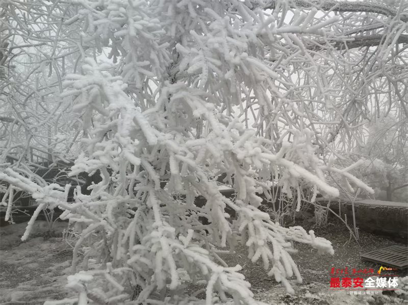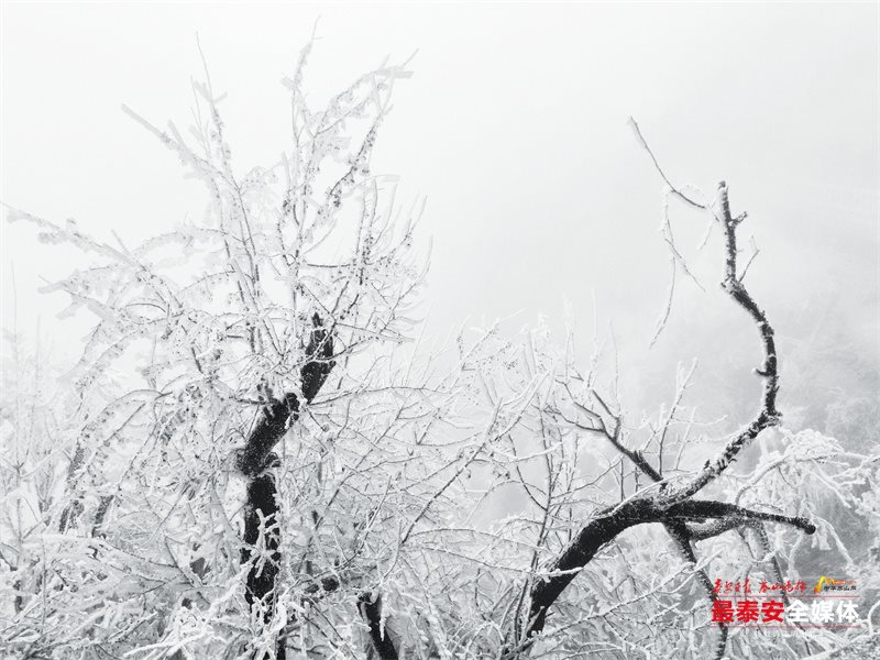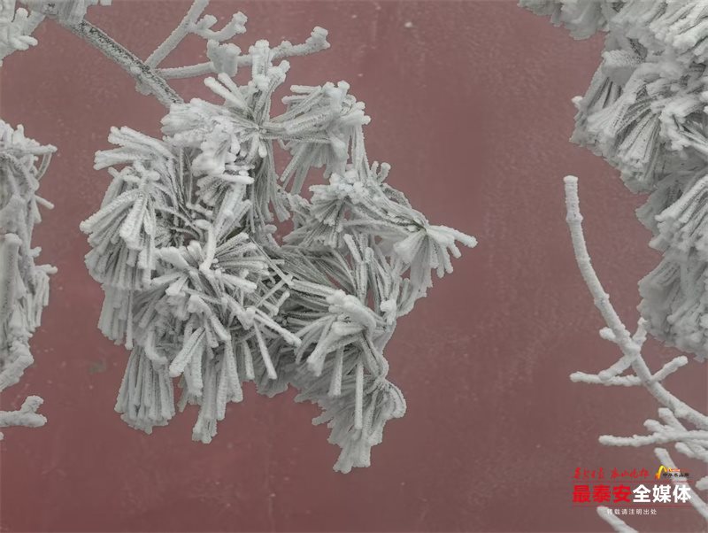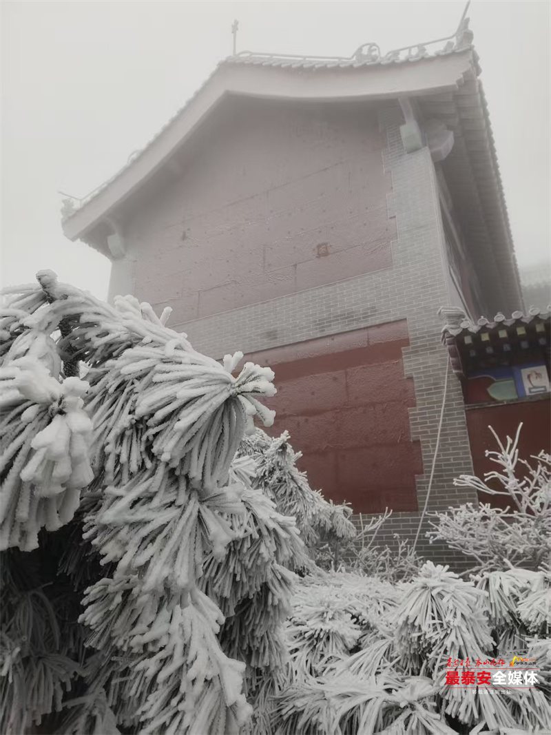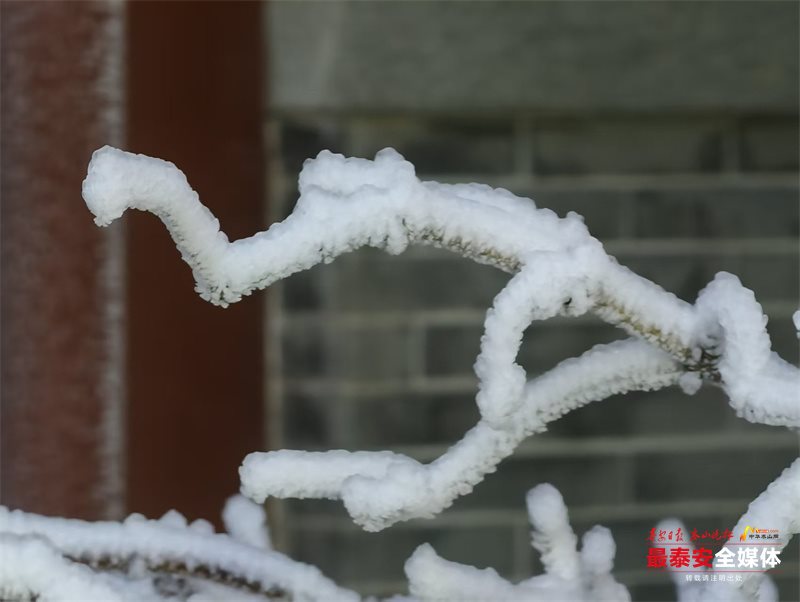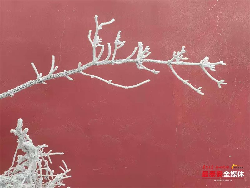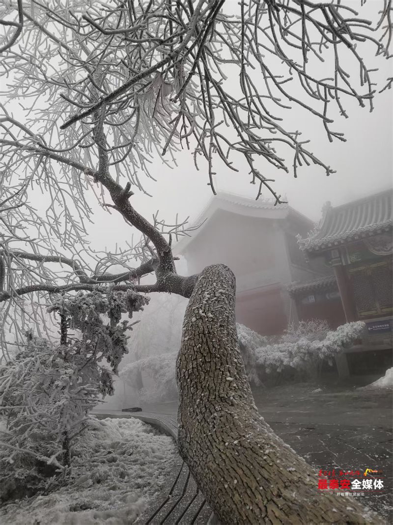 清晨时分,泰山被茫茫云雾笼罩。漫山遍野的树木、石阶乃至红墙古建,皆被冰层与霜花层层包裹,呈现出“千树万树梨花开”的壮丽景象,琼枝玉树,银装素裹。其间,红墙黛瓦的古建筑在冰雪的映衬下,更显古朴与厚重。