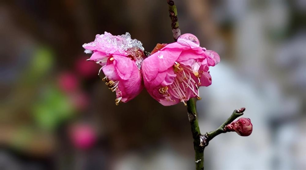 一落雪,江南就变成了水墨画,“雾凇沆砀,天与云、与山、与水,上下一白,湖上影子,惟长堤一痕、湖心亭一点,与余舟一芥、舟中人两三粒而已。”张岱如此描述到。雪中的世界,静若处子。但这种静并不让人觉得寂冷,因为江南的白雪下,时常还会透出红的、白的、粉的花来,那是开得正艳的茶梅花、梅花。一眼望去,会让人想起《红楼梦》中那些穿了雀金裘、凫靥裘等各类披风踏雪赏梅的公子小姐们,清气中透着绮丽。