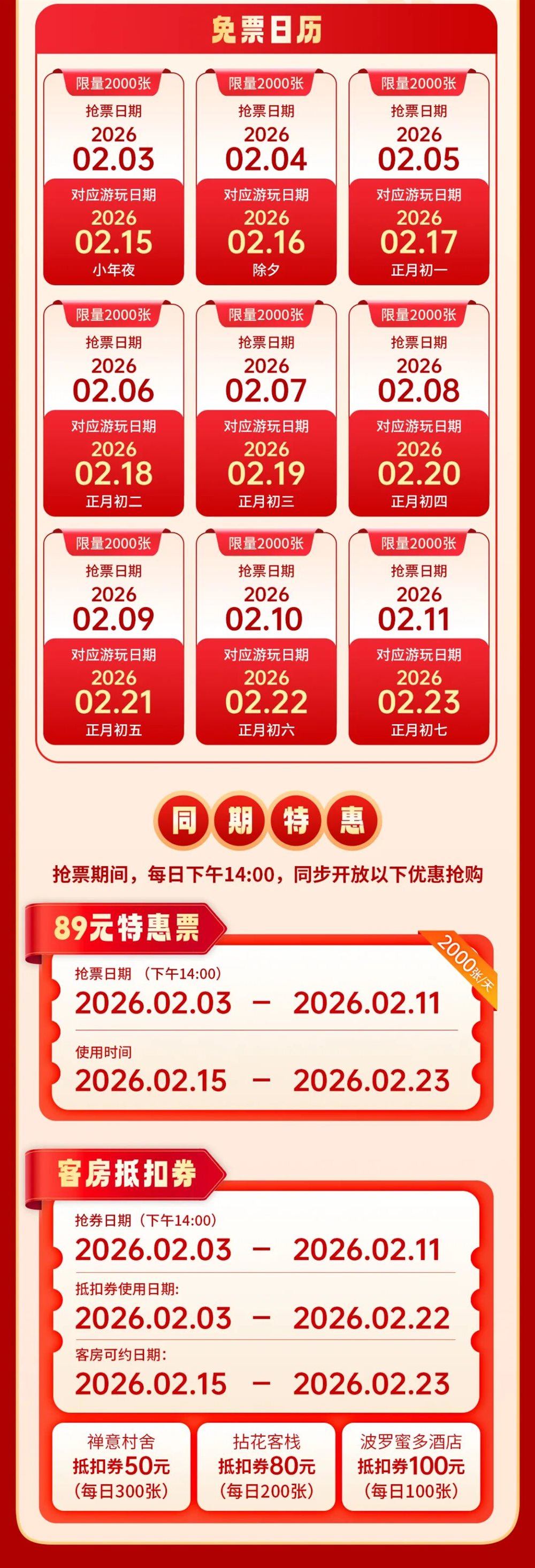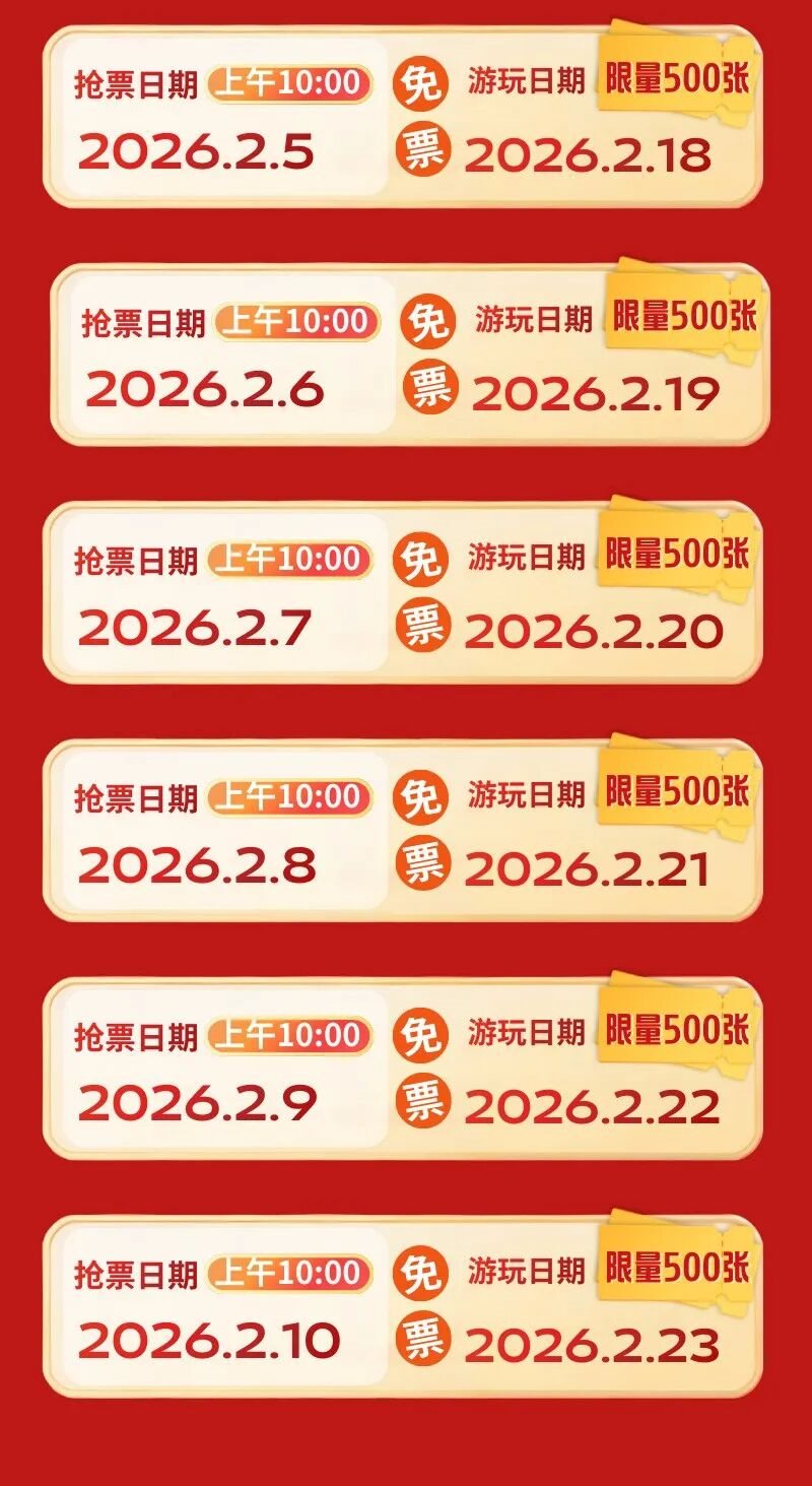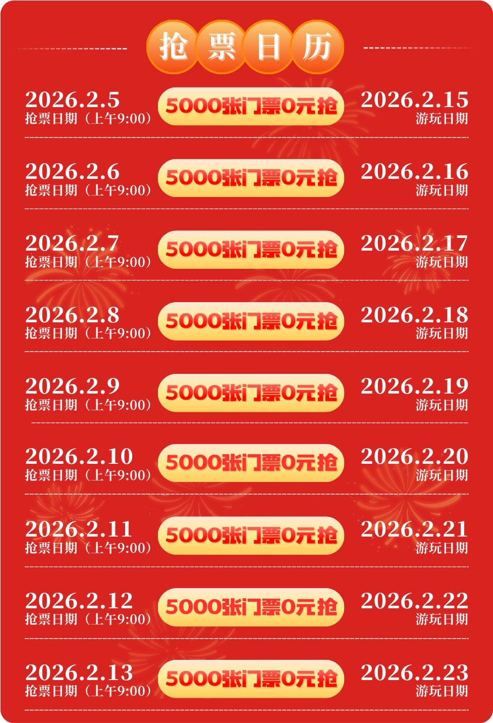 2026年2月5日至2026年2月13日,每日上午9:00准时开启抢票通道,抢完即止。