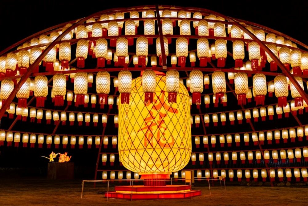 60位自贡手艺人打造20米长、9米高的国风主入口灯组。同时,“双龙戏珠”“二仙赐福”“北山四先生” 等特色灯组,将自贡花灯技艺与金华山文化深度融合,传统丝架工艺搭配现代光影技术,流光溢彩间尽显文化魅力。