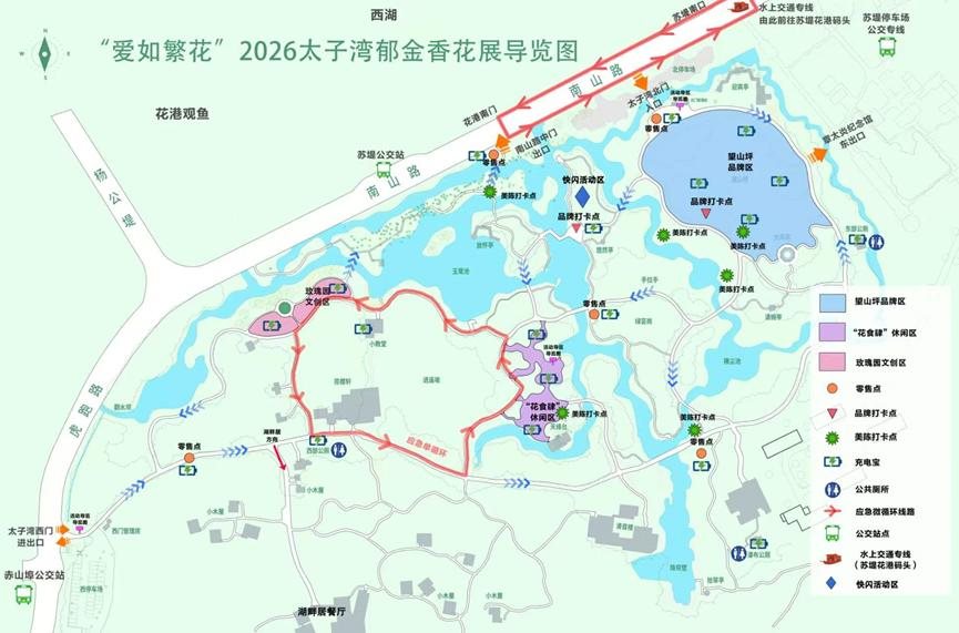 今年,杭州西湖风景名胜区凤凰山管理处在太子湾花展期间继续采用“分时预约”“水陆交通圈”等管理举措,以确保今年太子湾花事活动安全有序。