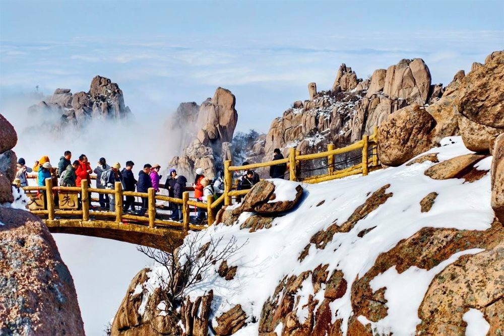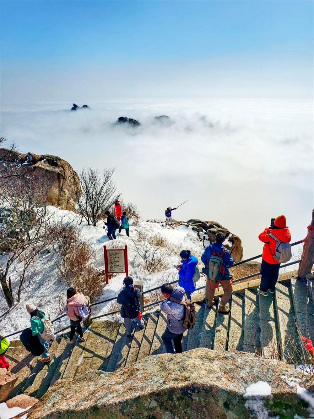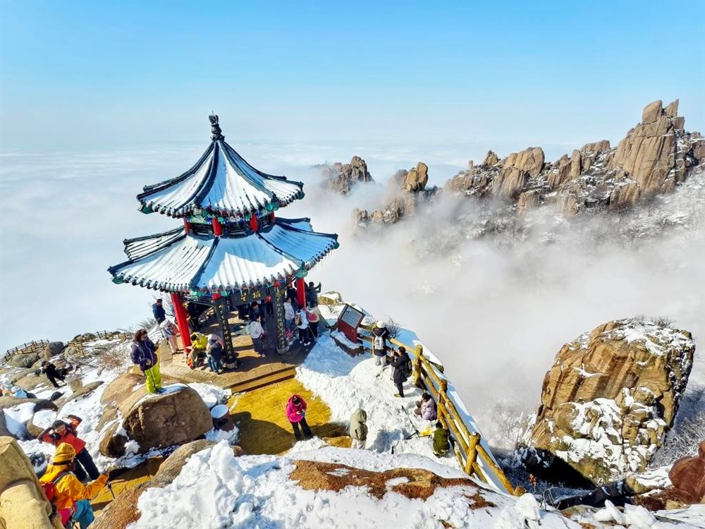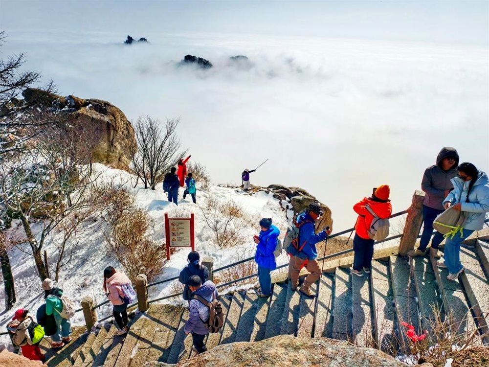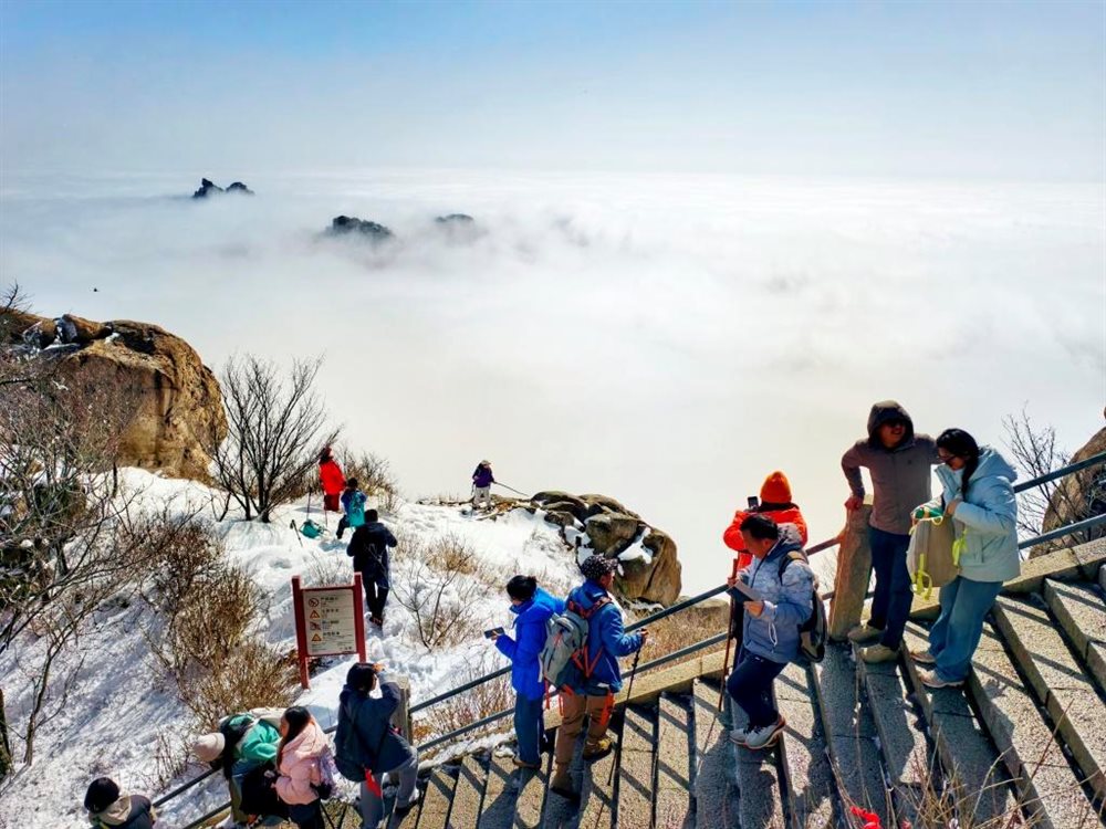 3月3日,一场春雪过后,崂山巨峰景区上演了令人屏息的自然奇观——浩瀚云海与皑皑白雪同时“登场”,将“海上第一名山”装扮成如梦似幻的琉璃世界。