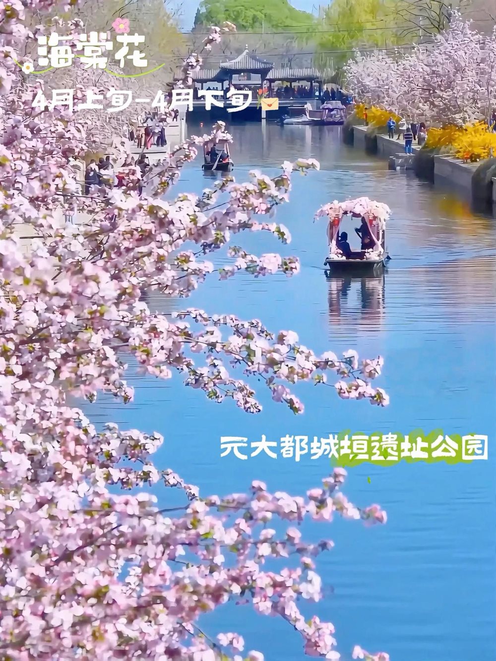 元大都城垣遗址公园、国家植物园(北园)、望京海棠花溪、北京世园公园、北京动物园、陶然亭公园、紫竹院公园、中国园林博物馆、柳荫公园等。