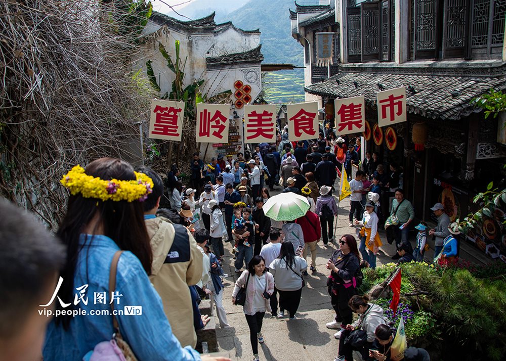 2026年3月15日,江西婺源篁岭景区桃花、樱花、玉兰花与油菜花竞相绽放,与白墙黛瓦的徽派民居交相辉映,勾勒出一幅诗意田园画卷。美景吸引众多游客打卡拍照,大家沉醉在烂漫春光里,构成春日里一道亮丽的风景线。刘国兴摄(人民图片网)