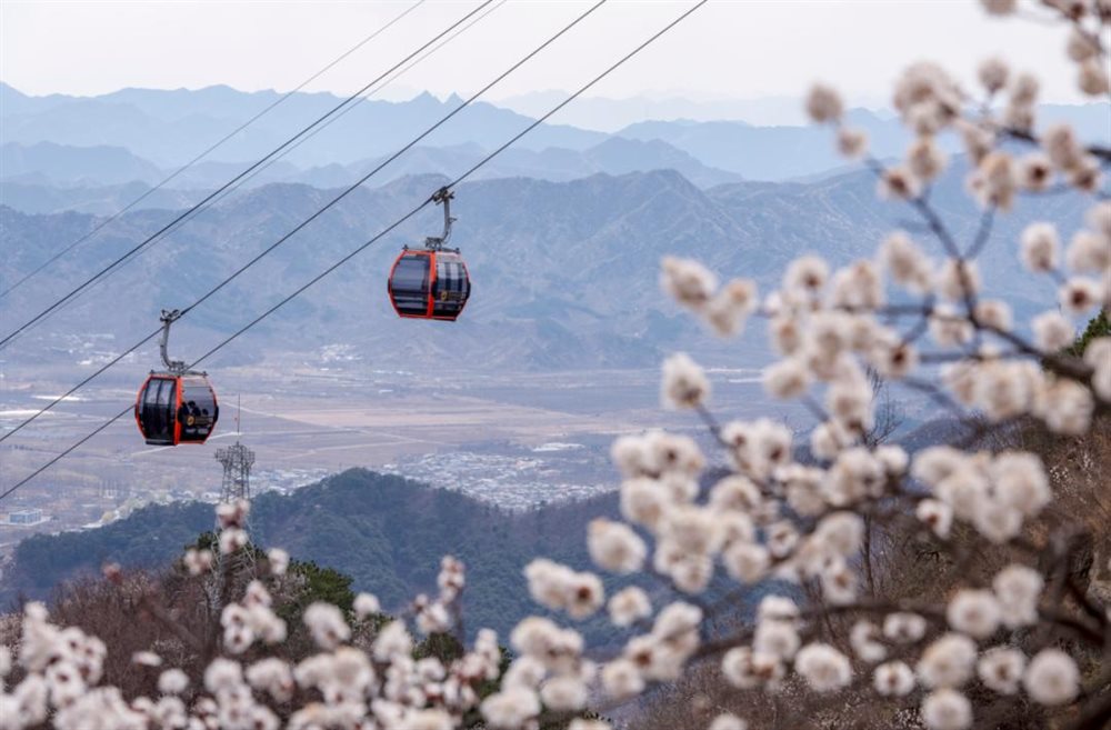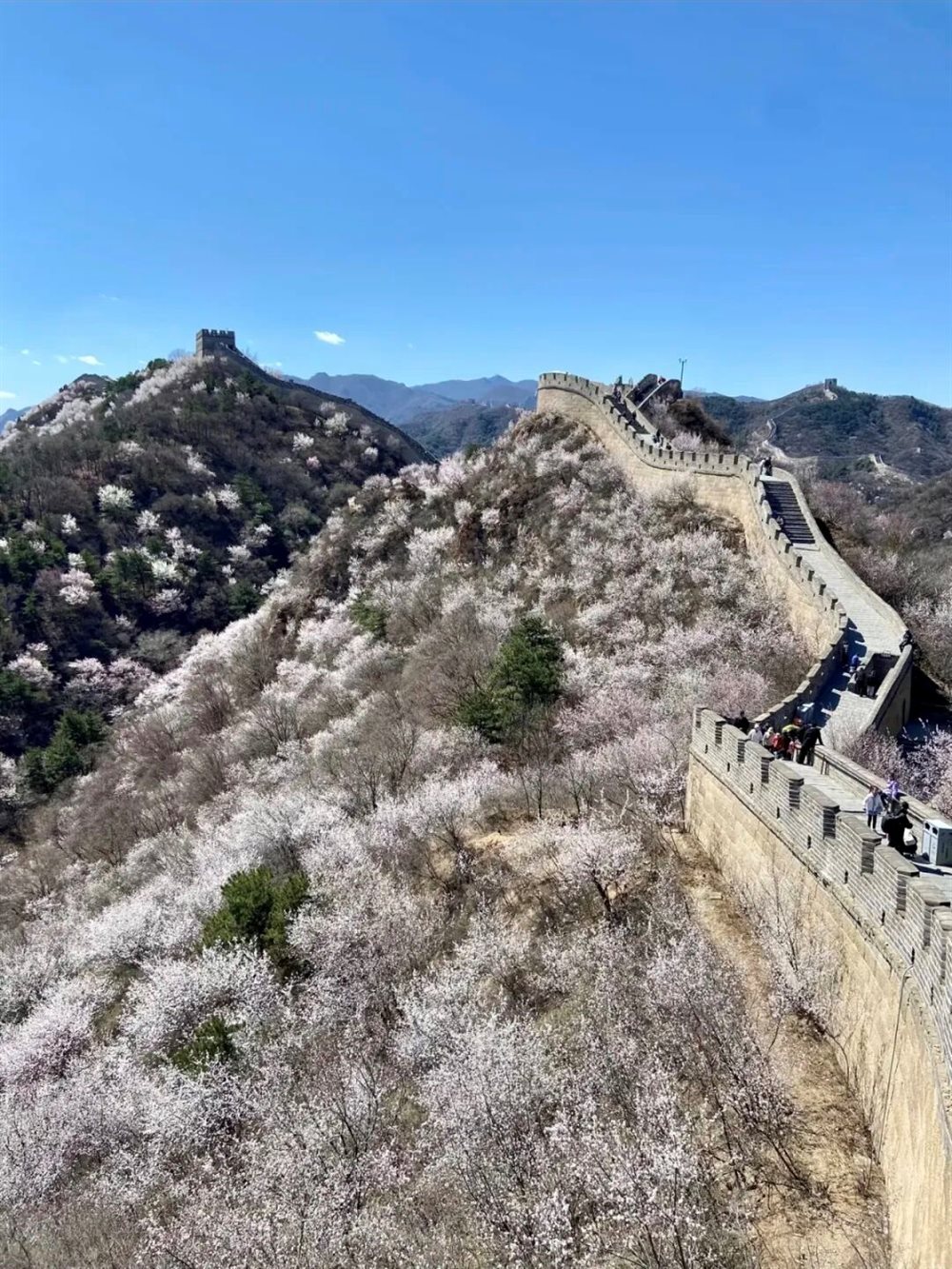 山桃花、杏花点缀在八达岭长城城墙两侧